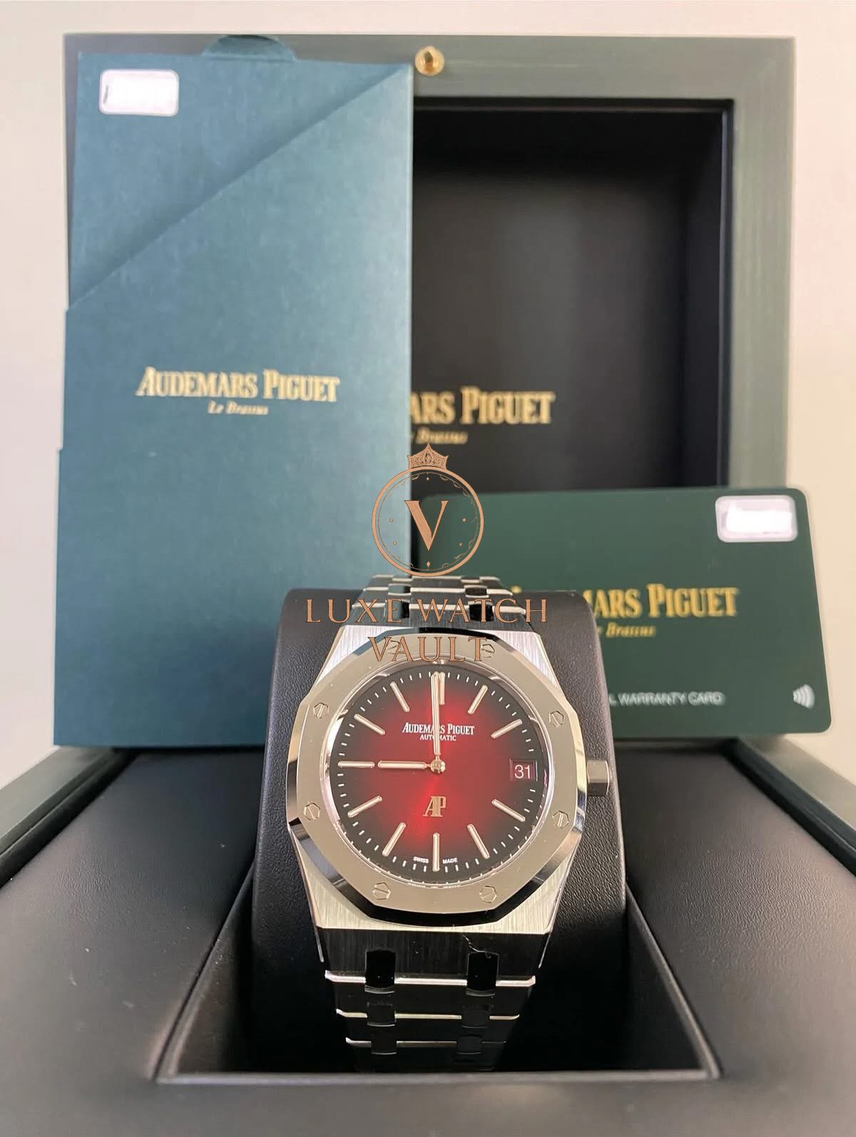 Audemars Piguet Royal Jumbo Extra-Thin Burgundy – 2024 – 16202XT *FULL SET* $190,000🚢Audemars Piguet Royal Oak Extra-Thin 16202XT, 39mm titanium case, burgundy dial, automatic caliber 7121 movement, 52h power reserve, unworn with original box, papers, and 2-year warranty valid until 2026.