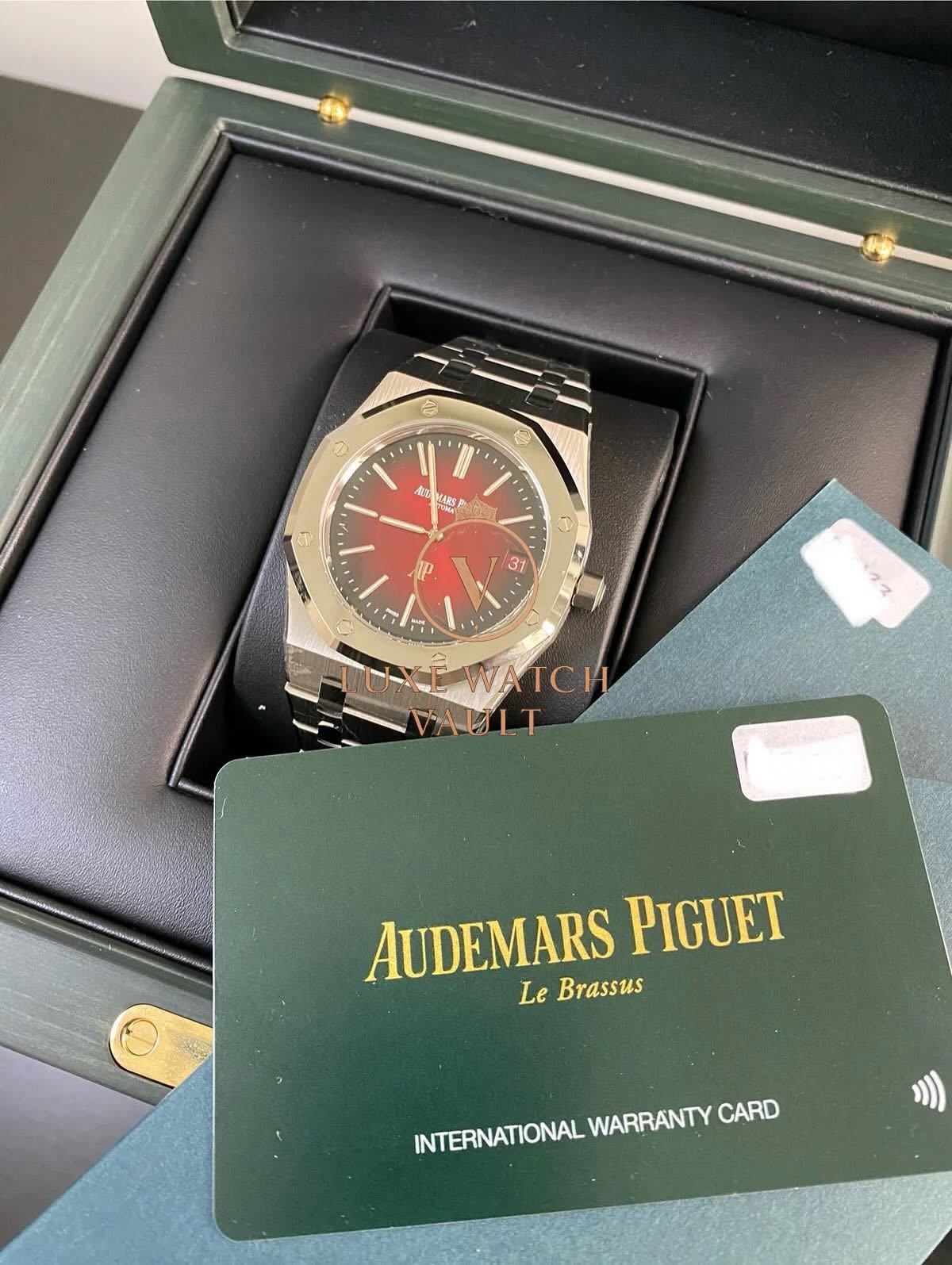 Audemars Piguet Royal Jumbo Extra-Thin Burgundy – 2024 – 16202XT *FULL SET* $190,000🚢Audemars Piguet Royal Oak Extra-Thin 16202XT, 39mm titanium case, burgundy dial, automatic caliber 7121 movement, 52h power reserve, unworn with original box, papers, and 2-year warranty valid until 2026.