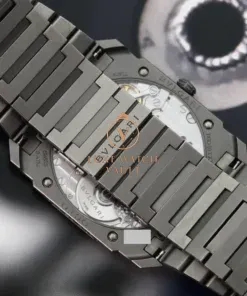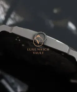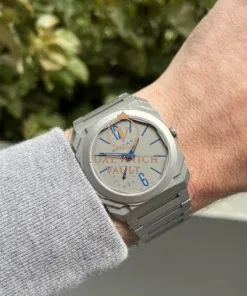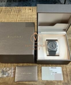 Fashioned in matte titanium, the case is an astonishingly thin 5.15mm while measuring 40mm across. Within it lies the traditional grey dial which matches the case and bracelet, though rather than the usual black markers lies beautiful blued printed markers with matching blue hands. It’s powered by the updated BVL 138 calibre which at the time of release was the thinnest automatic movement in the world, and measures in at a scant 2.23mm thick.