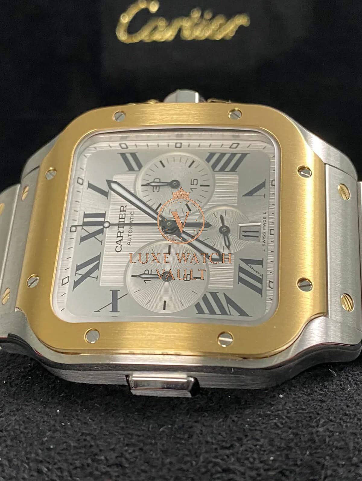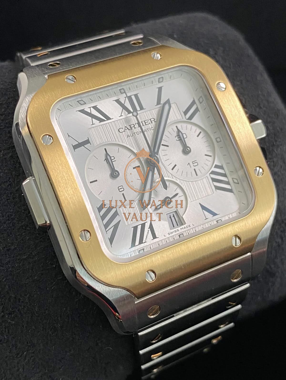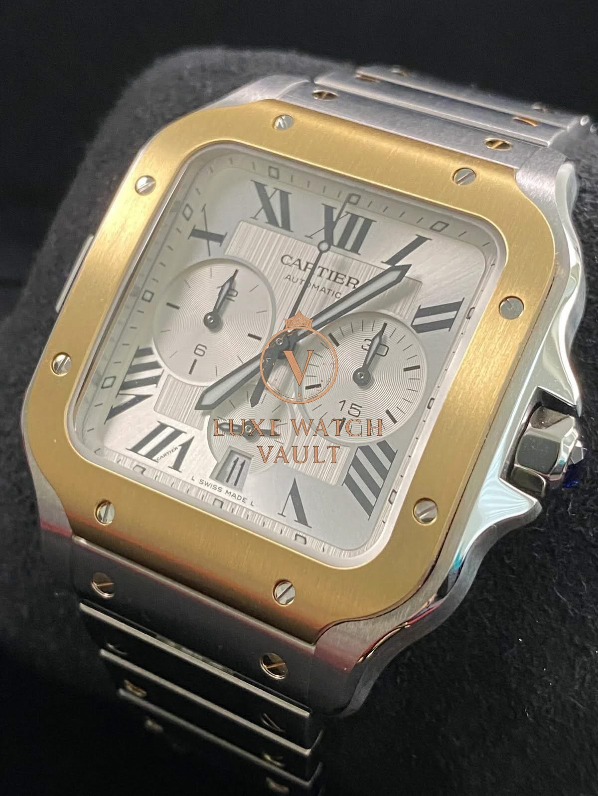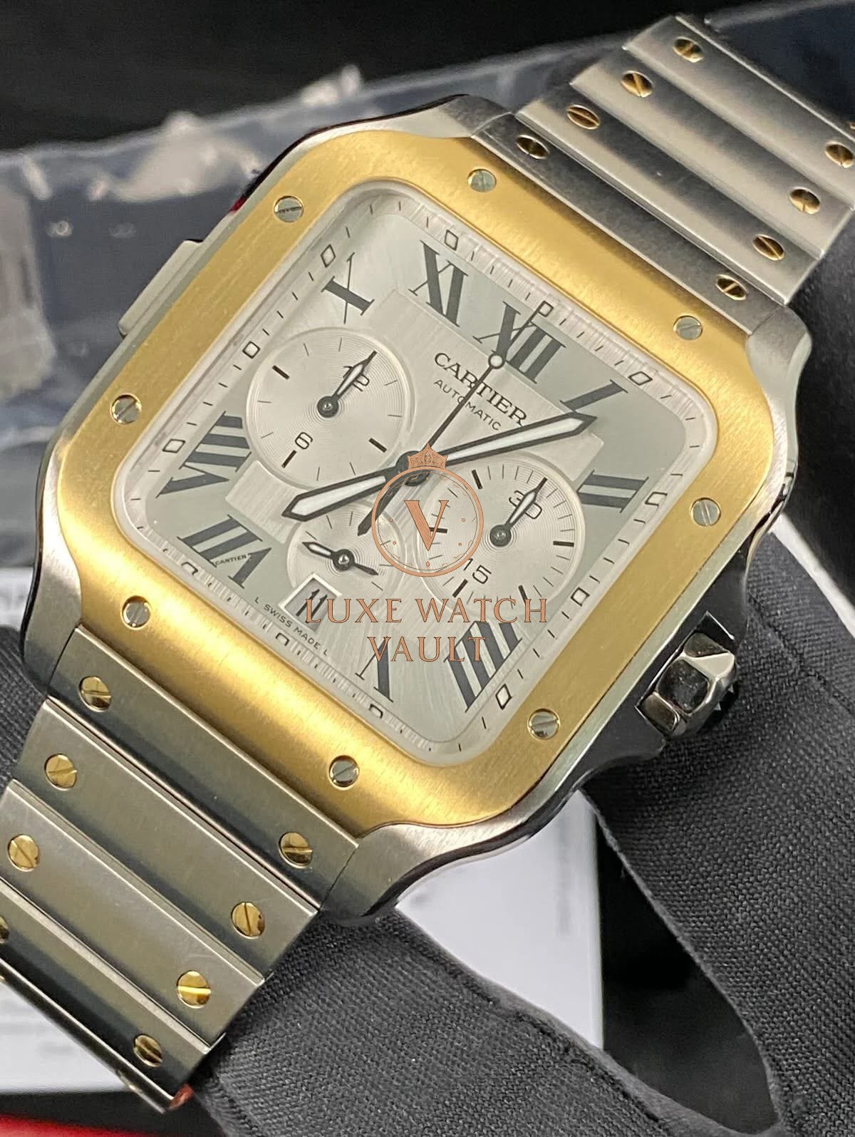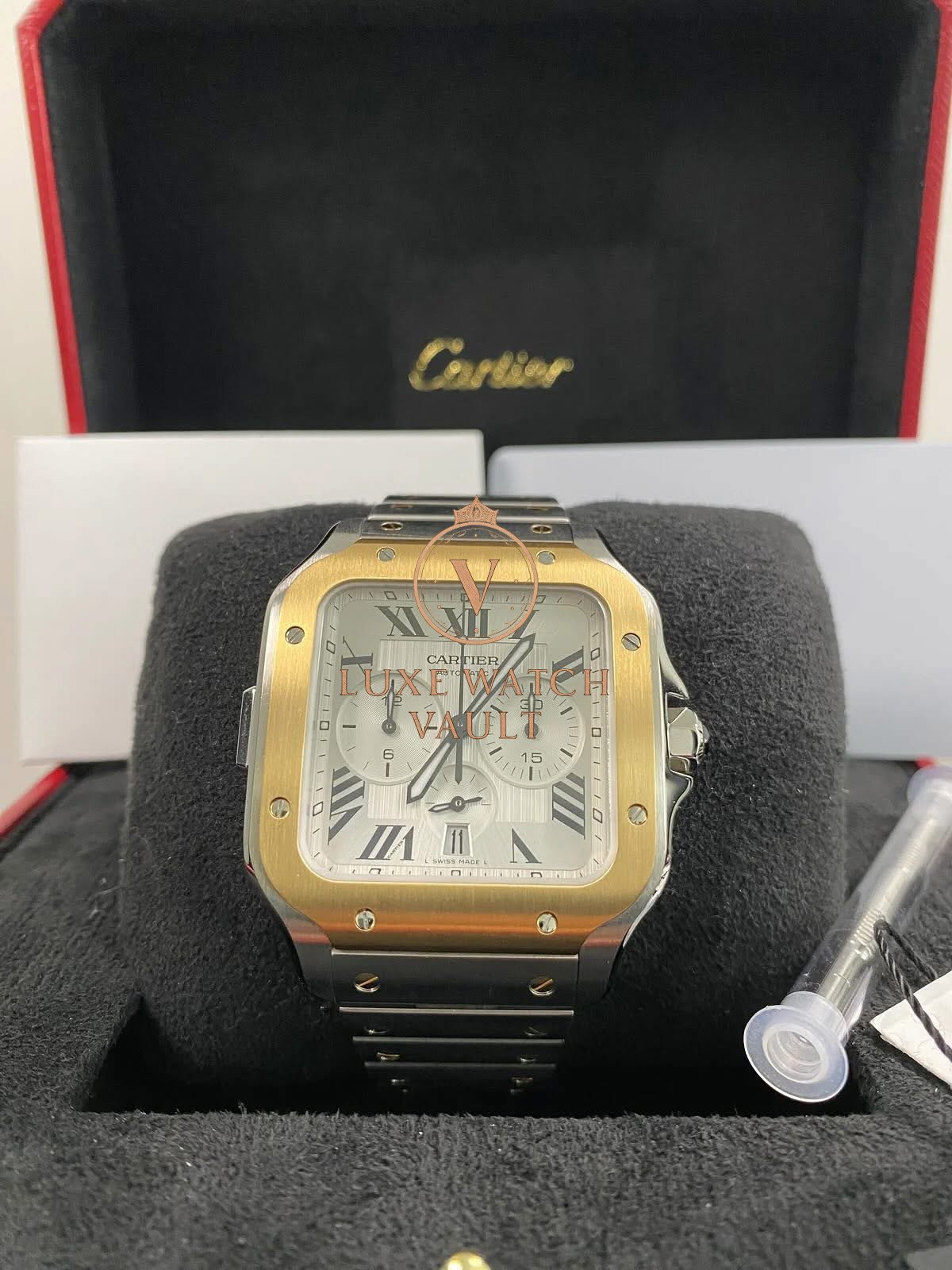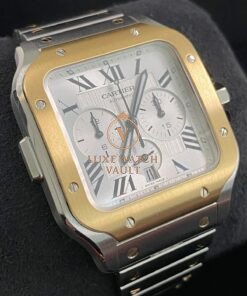 Cartier Santos de Cartier Chronograph Steel & Yellow Gold – 2025 – Silver Roman Dial – W2SA0008 *FULL SET* $12,000🚢Cartier Santos de Cartier Chronograph, 43.3mm, steel/gold, silver dial, gold bezel, automatic movement, 48h power reserve, unworn, with original box, papers, and 2-year warranty.