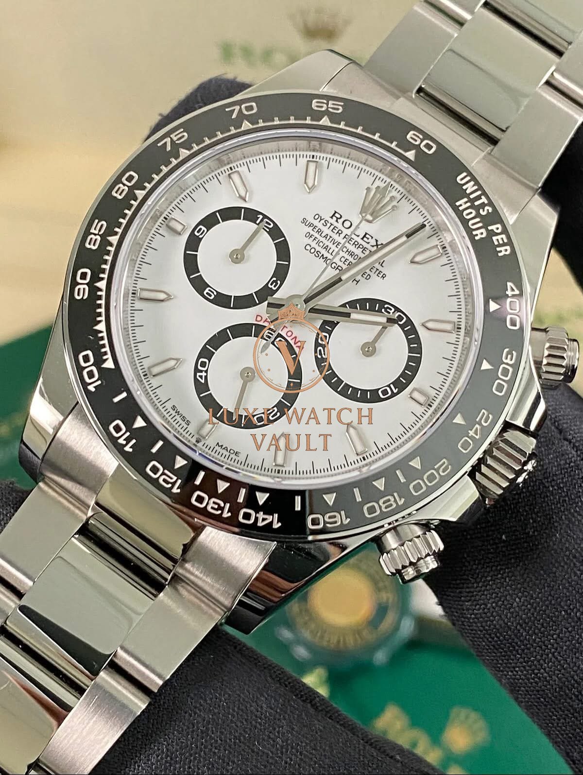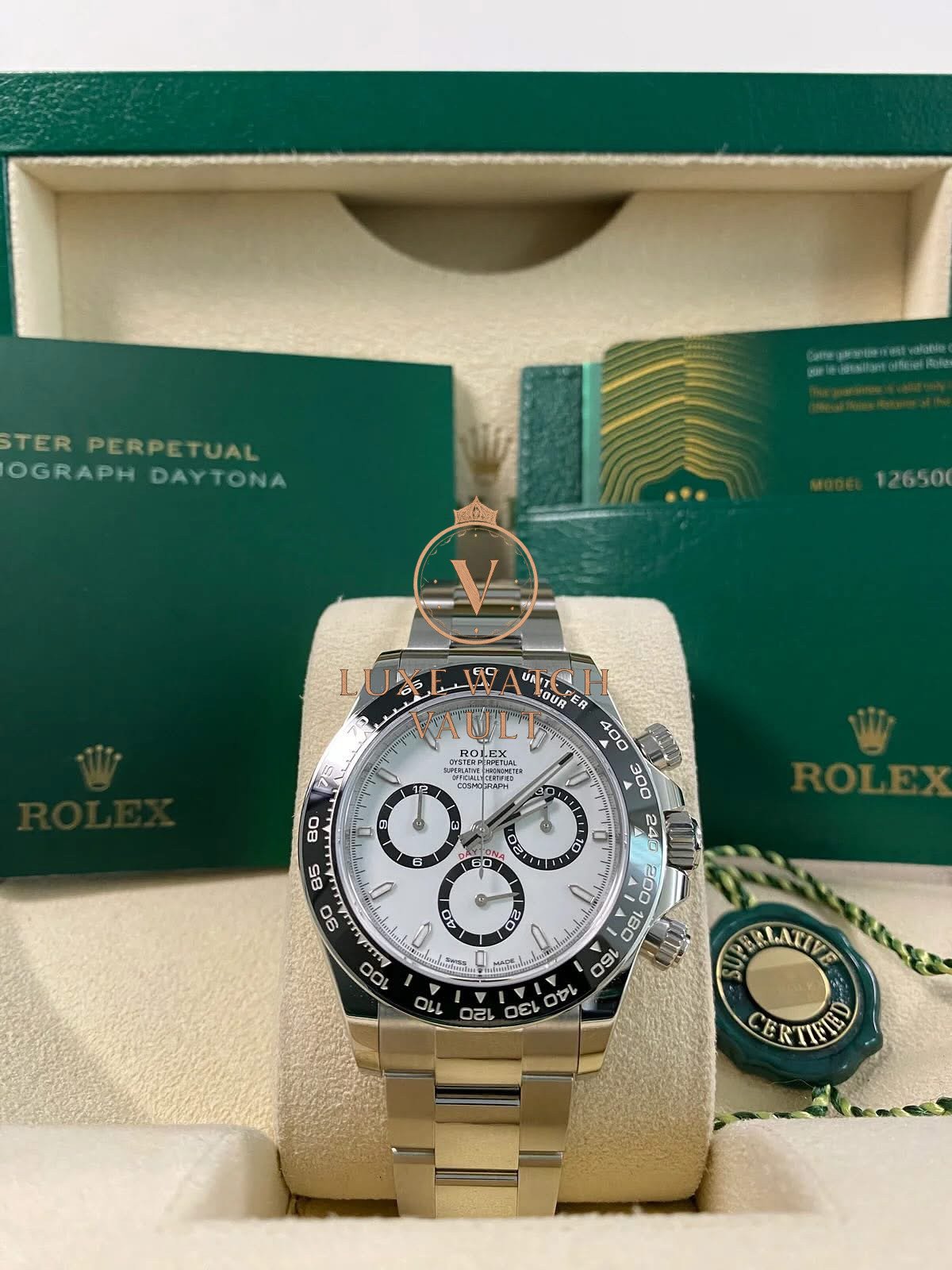 Rolex Cosmograph Daytona – 2025 – “Panda” – 126500LN *FULL SET* $31,500🚢2025 Rolex Cosmograph Daytona “Panda” 126500LN. 40mm stainless steel case, white dial with black sub-dials, black ceramic bezel, automatic movement, 72h power reserve. Unworn, complete with original box, papers, and 5-year warranty.
