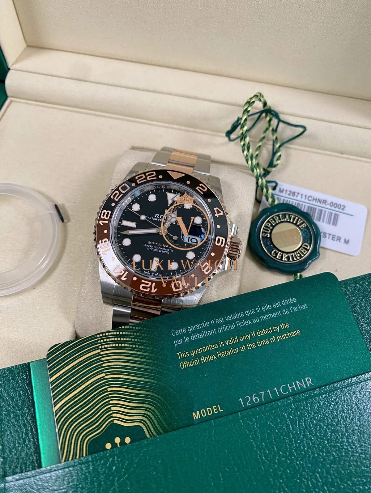 Rolex Everose Rolesor GMT-Master II – 2025 – “Root Beer” – 126711CHNR *FULL SET* $19,500🚢2025 Rolex GMT-Master II “Root Beer” 126711CHNR, 40mm, gold/steel, black dial, brown/black ceramic bezel, automatic movement, unworn, with original box, papers, and 5-year warranty.