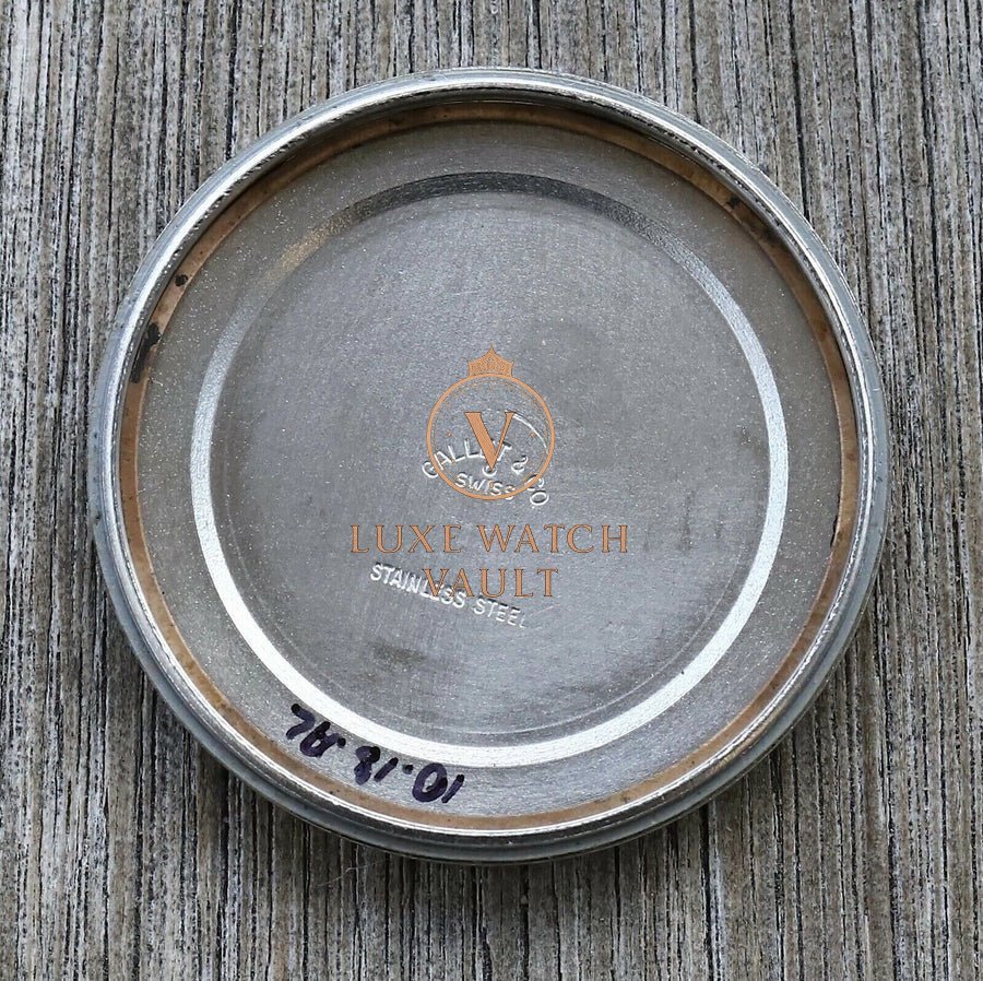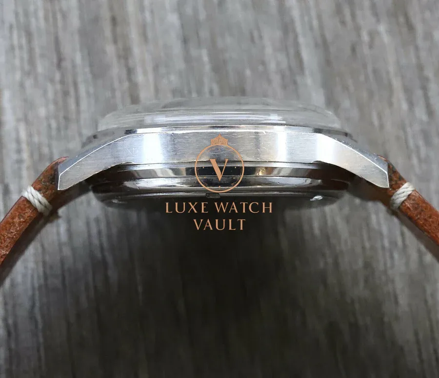 The 37mm steel case is extremely well preserved, and shows sharp lines and even lugs. The screw-down case back is also in excellent condition, with clear stamping on the inside. Acrylic domed crystal is in fantastic condition. Original unsigned crown.