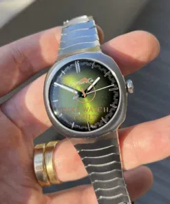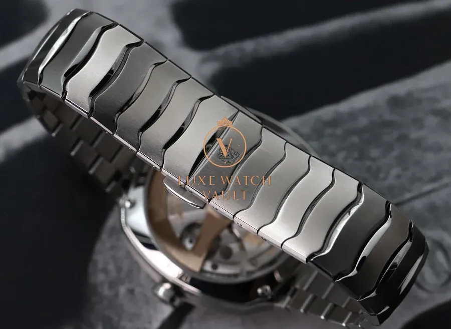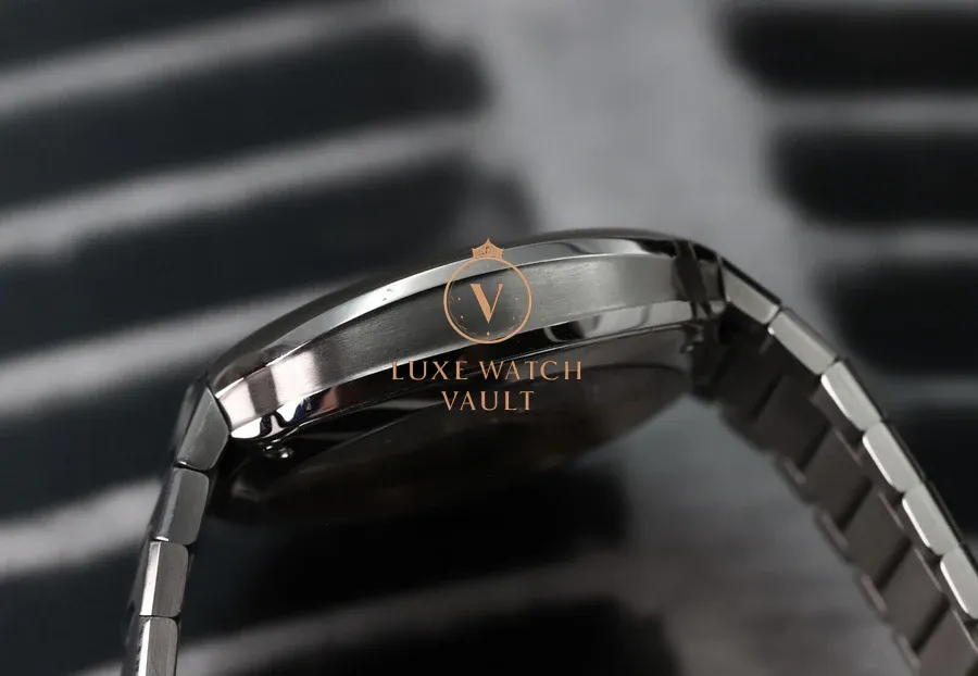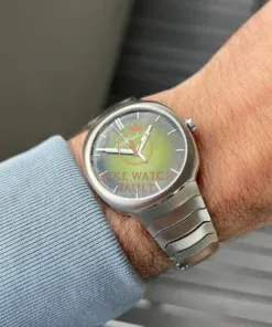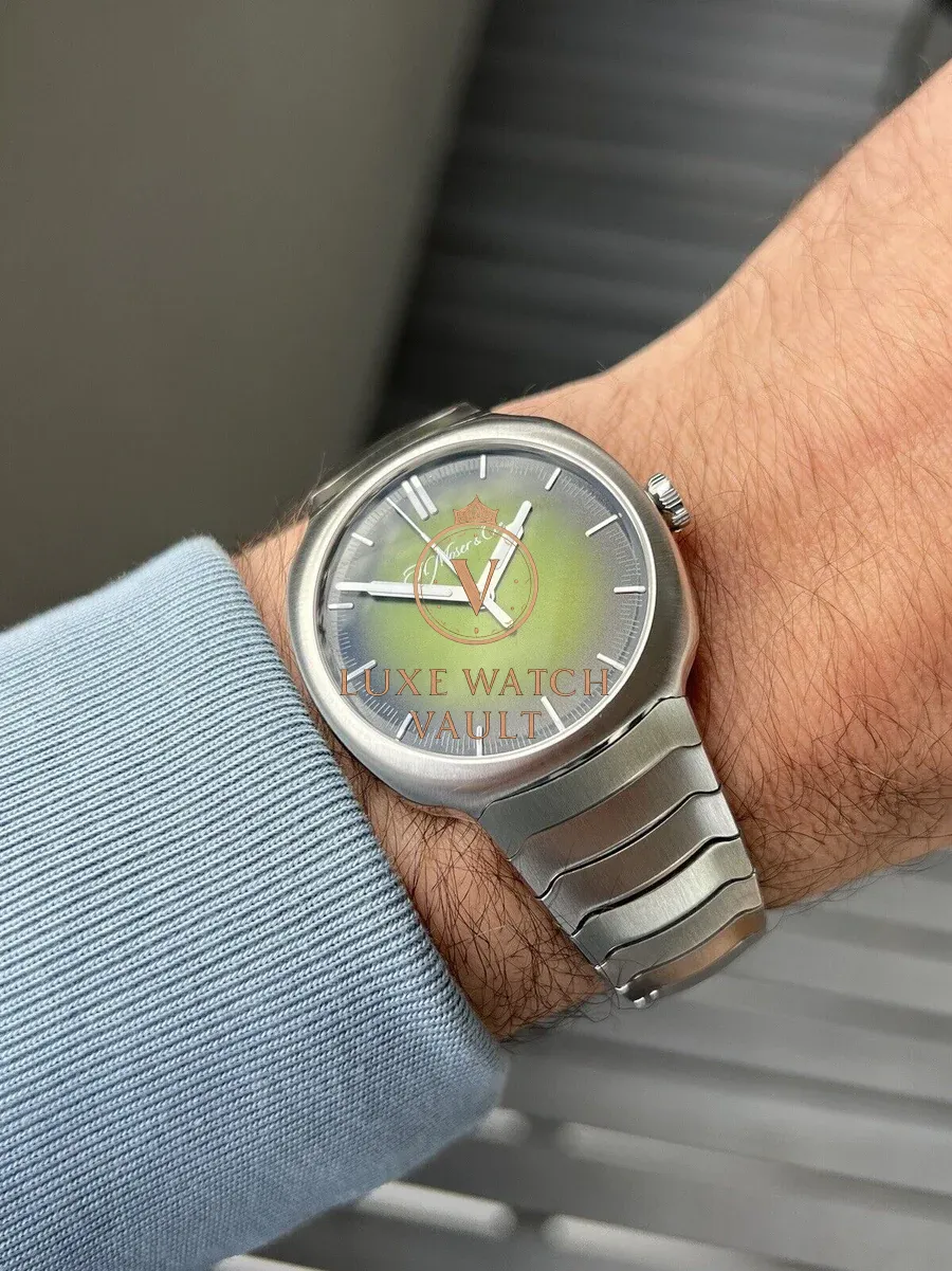 Utilising a stainless steel case in 40mm, it contains very few straight lines, and instead features flowing lines that transition with a seamlessness not usually seen in integrated sports watches which tend to usually favour sharp, geometric lines. Within this spectacular case lies an amazing green smoke fume dial that appears to transition between a deep olive to a bright green depending on the light, and has the most amazing effect of the inky blackness around the outer edges seeming to converge on the centre portion of the dial when viewed on certain angles. It’s very special in person. It’s topped off by applied indices covered in Globolight, and is powered by the in-house HMC 200 movement with 3 day power reserve and very high levels of finishing. This level of finish carries across to the integrated steel bracelet, which is both comfortable and beautiful.