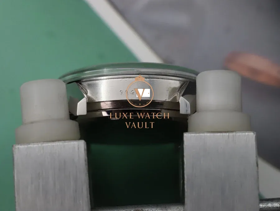 The dial is in excellent condition. There’s some light scratches visible under a loupe, and a few small indents around the outer edges. Shows minor spotting. Tritium plots mostly intact. 3 and 9 are mostly missing, though remnants remains. Minute track on the rehaut shows some staining as is typical of these.