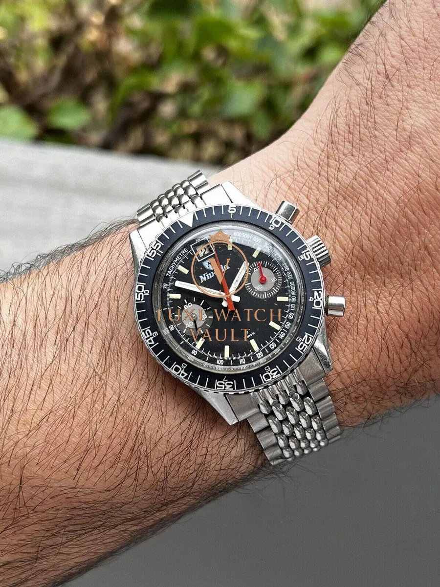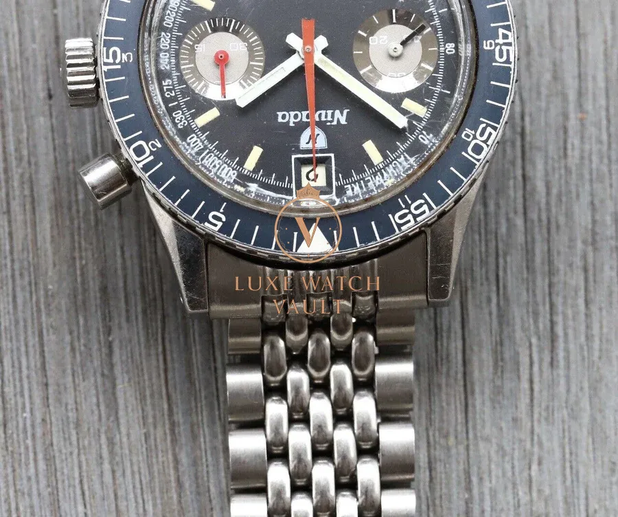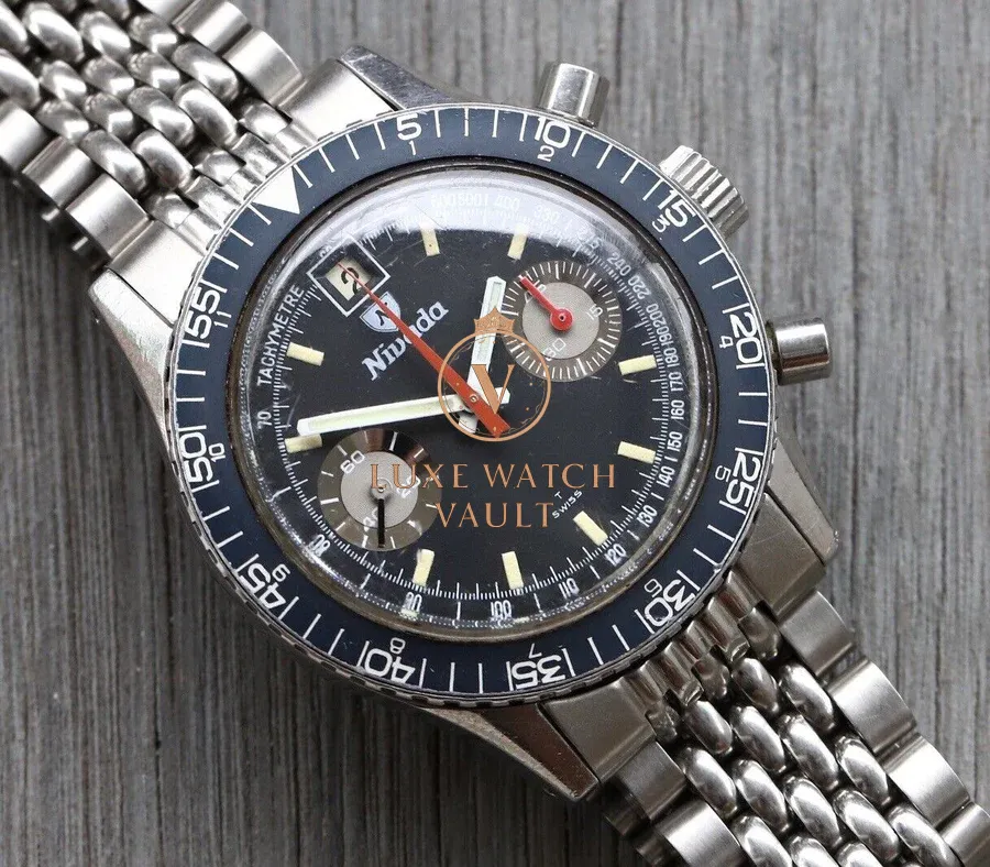 Powering it is the fantastic Valjoux 234 manual wind chronograph, and its mounted to a beads of rice bracelet with Nivada signed clasp. Will fit up to a 7.5in wrist.