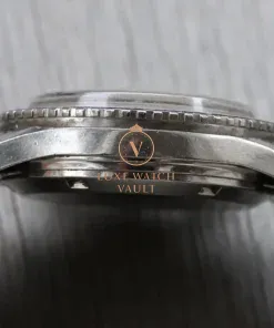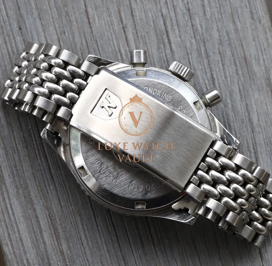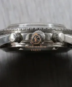 It utilises a 38mm case made in steel, which back in its day was water resistant to 200m. Atop this case sits a large bi-directional bezel surrounding a domed acrylic crystal. Within this lies a beautiful matte black sterile dial, which means it does without ‘Chronomaster Aviator Sea Diver’ written on it for a much cleaner look. It features an internal tachy scale, date at 12, tritium markers and lovely mirrored sub-registers for running seconds and 45 minute counter.
