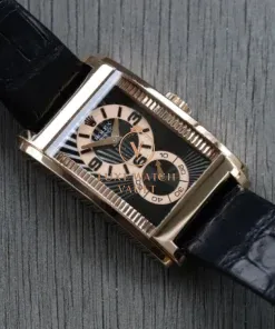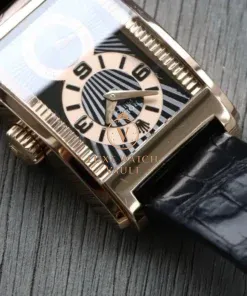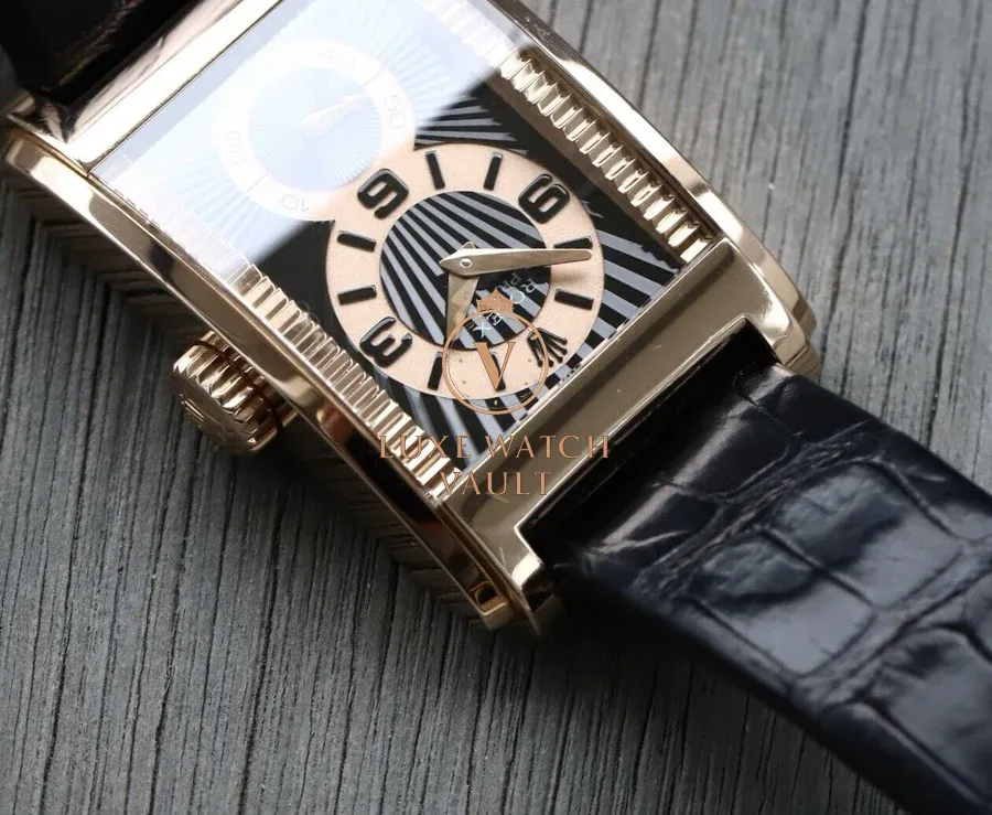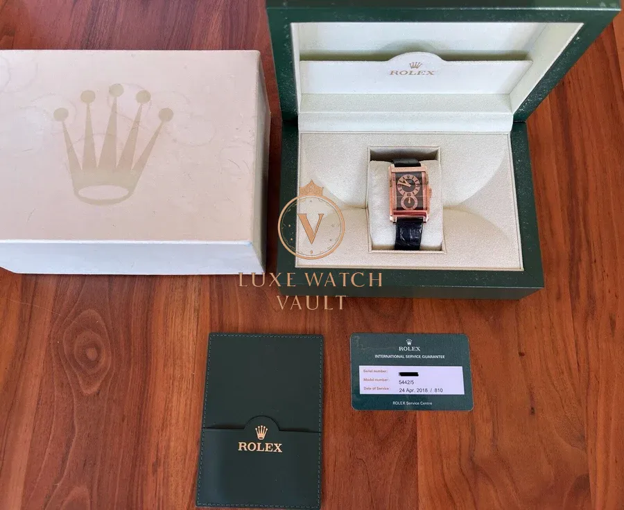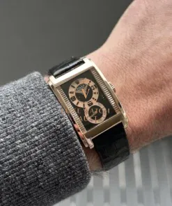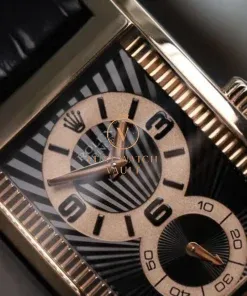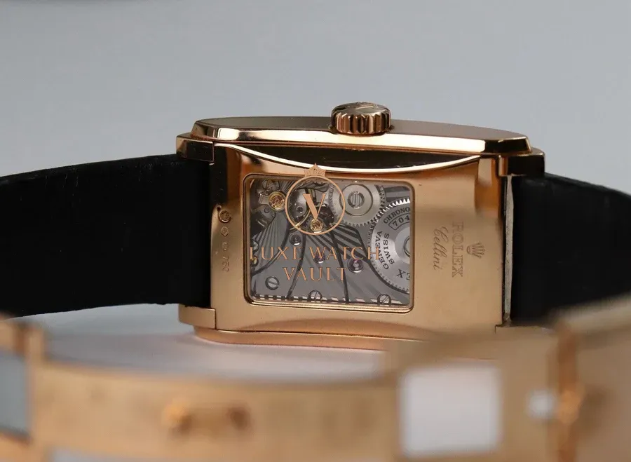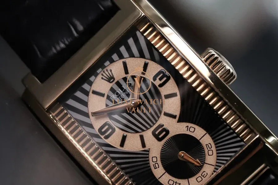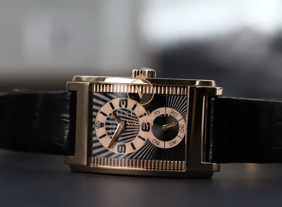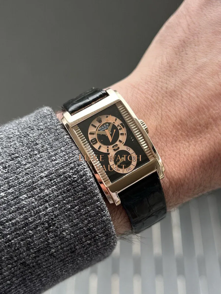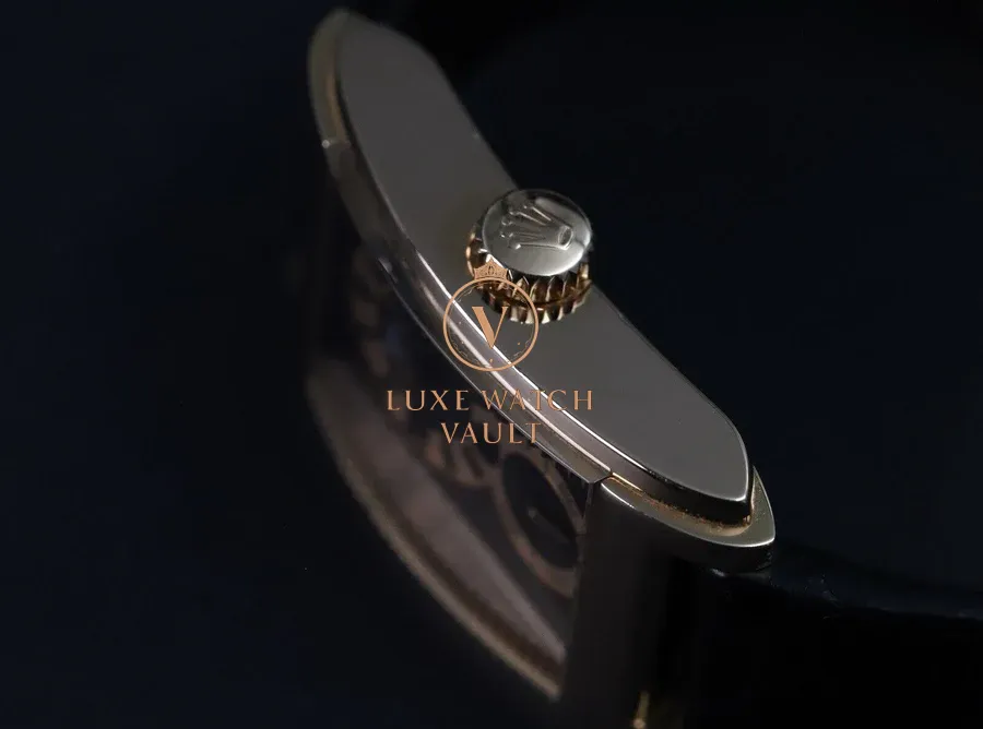 For me, the line that is often most overlooked has actually created some of Rolex’s most interesting watches over the years. From the Midas and King Midas, to the reference we have here, the Cellini line has some hidden gems that lots of collectors do not even know exist. The reference we have here is the 5442/5, and dates to 2005. It utilises a rectangular case full of curves, fashioned from Everose gold, and measures in at approximately 27mm x 48mm. It houses a deep black dial with a deep-etched sunray style pattern known as Rayon flammé de la gloire, surrounding the upper hour and minute sub-dial, and lower sub-seconds. The outer edges of the dial are flanked by a ribbed pattern, feeling very Art Deco and unlike anything else in the Rolex range. It reminds me a little of a Lange Cabaret on the wrist, though a little more curvaceous.