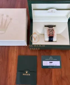 Out back we have a display back giving a view into the magnificent calibre 7040 which is a COSC-certified in-house movement with around 70 hours of power reserve, and a lovely level of finish not usually seen on a Rolex. It’s mounted to a Rolex Alligator strap with Everose deployant. If you’re a Rolex nut in need of a dress watch, this is the one.