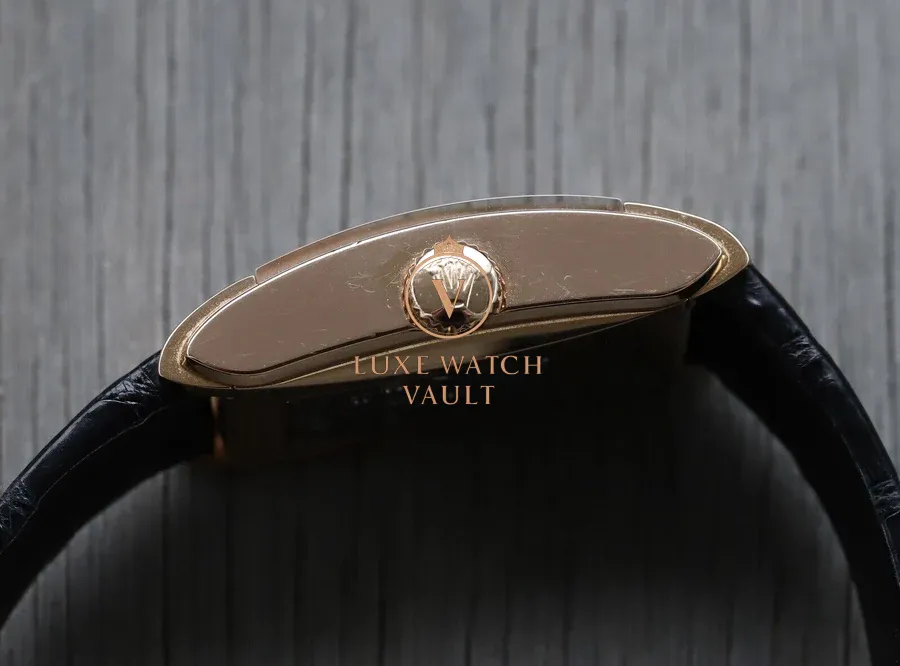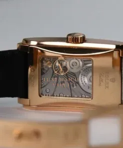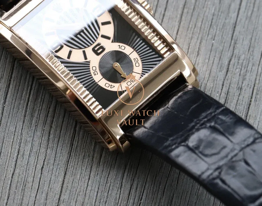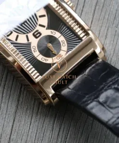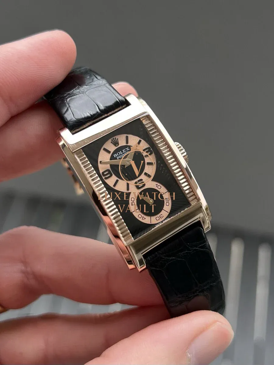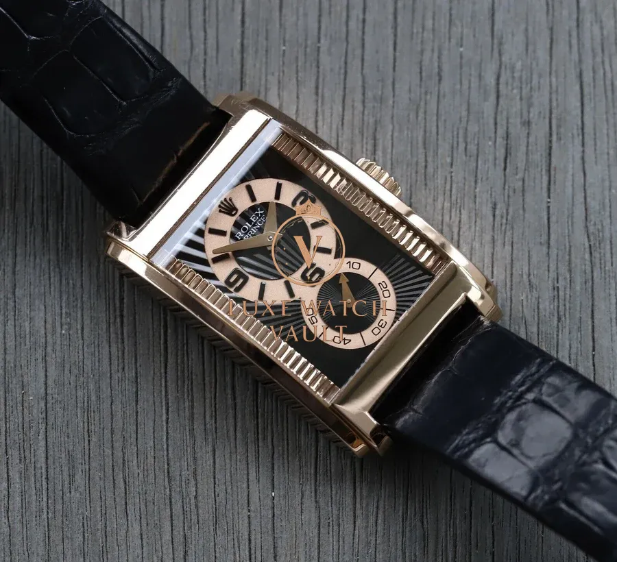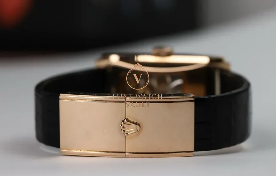 For me, the line that is often most overlooked has actually created some of Rolex’s most interesting watches over the years. From the Midas and King Midas, to the reference we have here, the Cellini line has some hidden gems that lots of collectors do not even know exist. The reference we have here is the 5442/5, and dates to 2005. It utilises a rectangular case full of curves, fashioned from Everose gold, and measures in at approximately 27mm x 48mm. It houses a deep black dial with a deep-etched sunray style pattern known as Rayon flammé de la gloire, surrounding the upper hour and minute sub-dial, and lower sub-seconds. The outer edges of the dial are flanked by a ribbed pattern, feeling very Art Deco and unlike anything else in the Rolex range. It reminds me a little of a Lange Cabaret on the wrist, though a little more curvaceous.