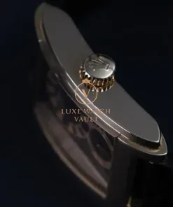 Out back we have a display back giving a view into the magnificent calibre 7040 which is a COSC-certified in-house movement with around 70 hours of power reserve, and a lovely level of finish not usually seen on a Rolex. It’s mounted to a Rolex Alligator strap with Everose deployant. If you’re a Rolex nut in need of a dress watch, this is the one.