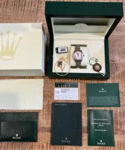 Comes with outer box, inner box, warranty card (expired), Datejust booklet, Service booklet, card holder, white hang tag, green hang tag and spare links to complete the bracelet.