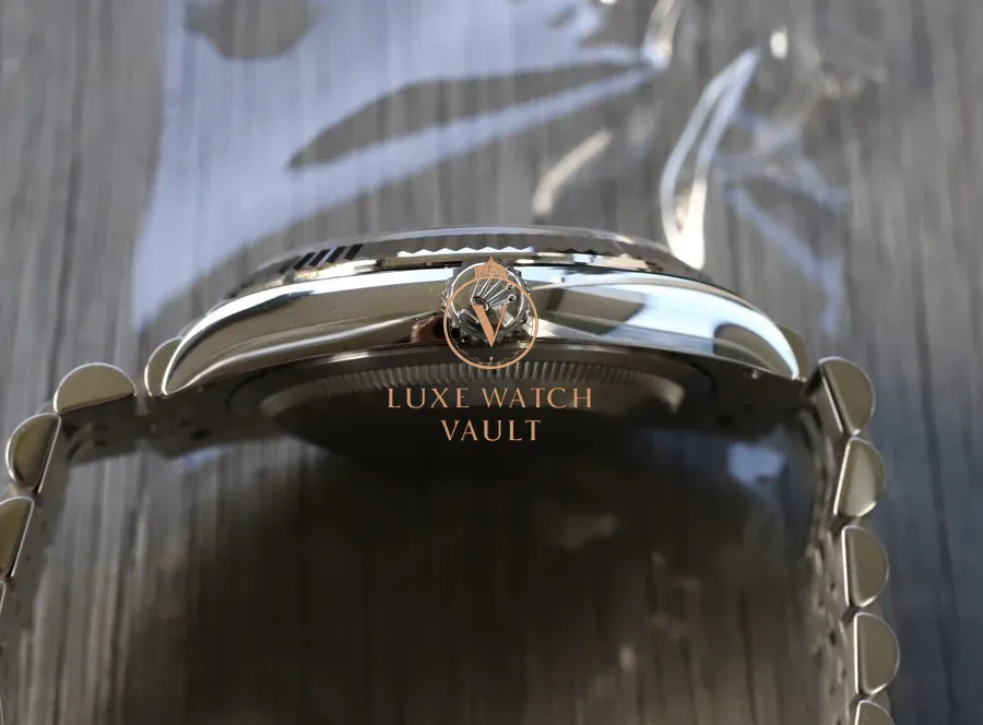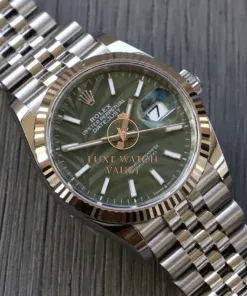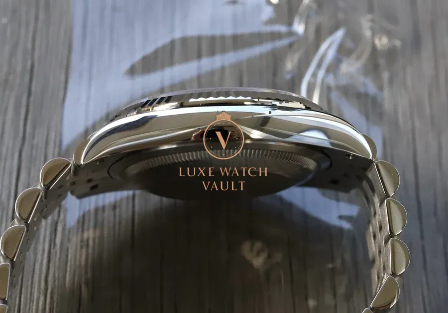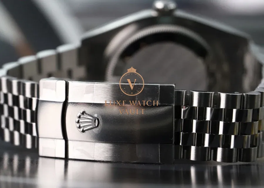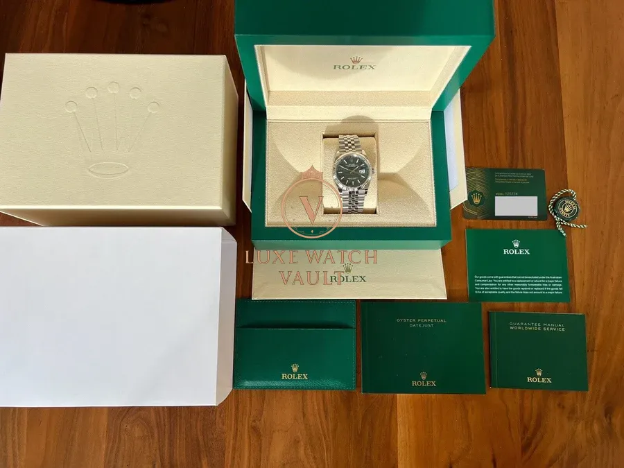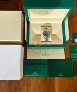 Comes with outer sleeve, outer box, inner box, warranty card dated 2024, Datejust booklet, Service booklet, card holder, green hang tag and Watch Vault cleaning cloth.