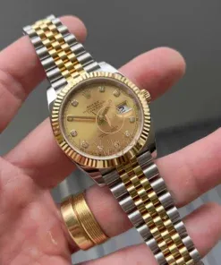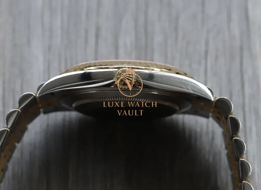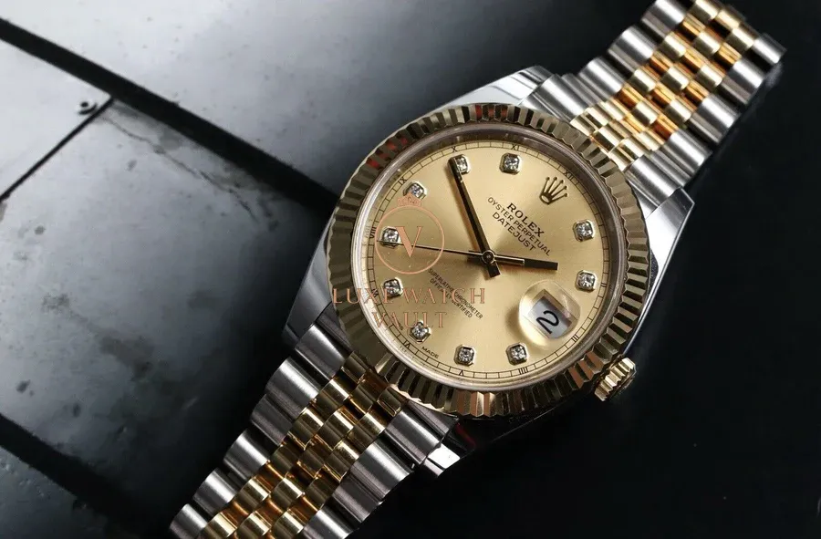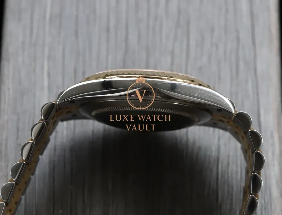 The Jubilee looks fantastic, and is super comfortable on-wrist. It also shows up less marks and scratches than the Oyster with polished centre links, especially in gold. The diamond dial is spectacular, with a subtle sunburst finish, and markers that aren’t too OTT. The yellow gold fluted bezel compliments this dial perfectly, picking up and playing with the light, and it’s the classic combination for these watches.