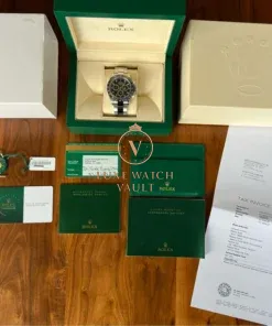 Paraphernalia: Outer sleeve, outer box, inner box, instruction booklet, service guide, warranty card (expired), hang tags, card holder, service receipt, service card and Watch Vault cleaning cloth.
