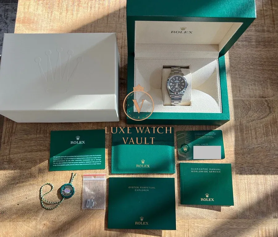 Comes with outer box, inner box, hang tag, guarantee manual, instruction manual, warranty card dated Q1 2024 and spare link to complete the bracelet