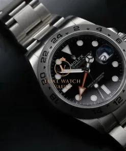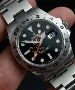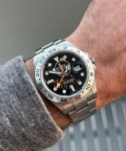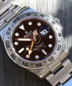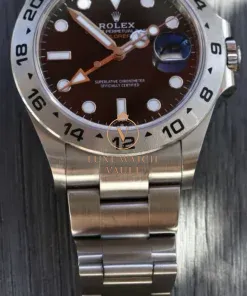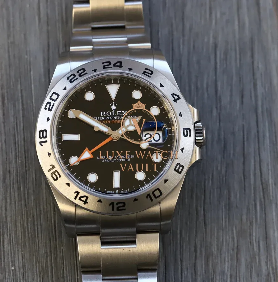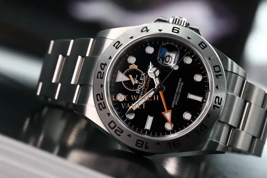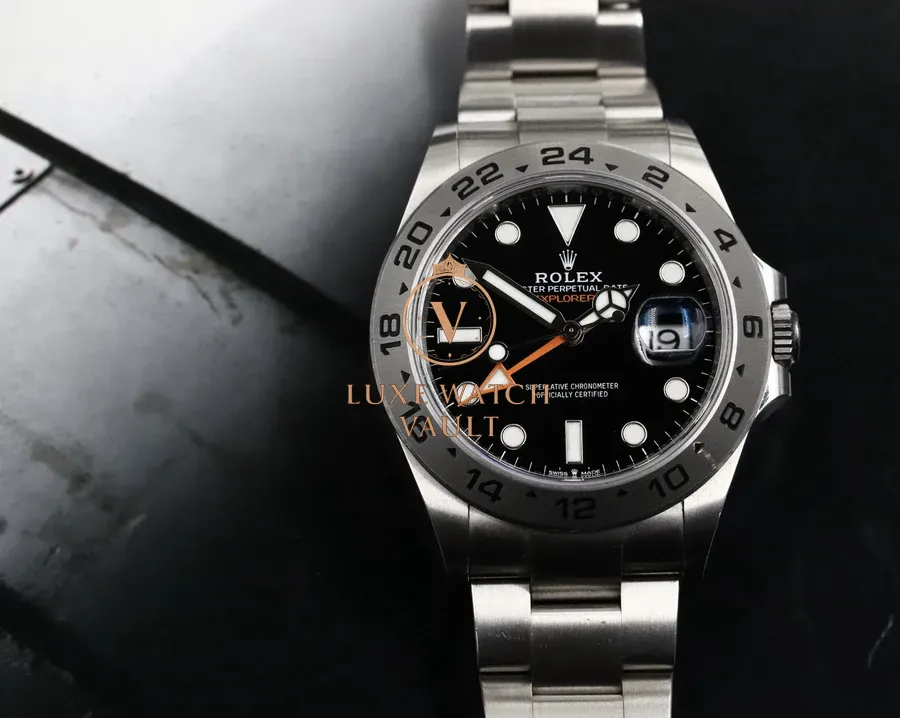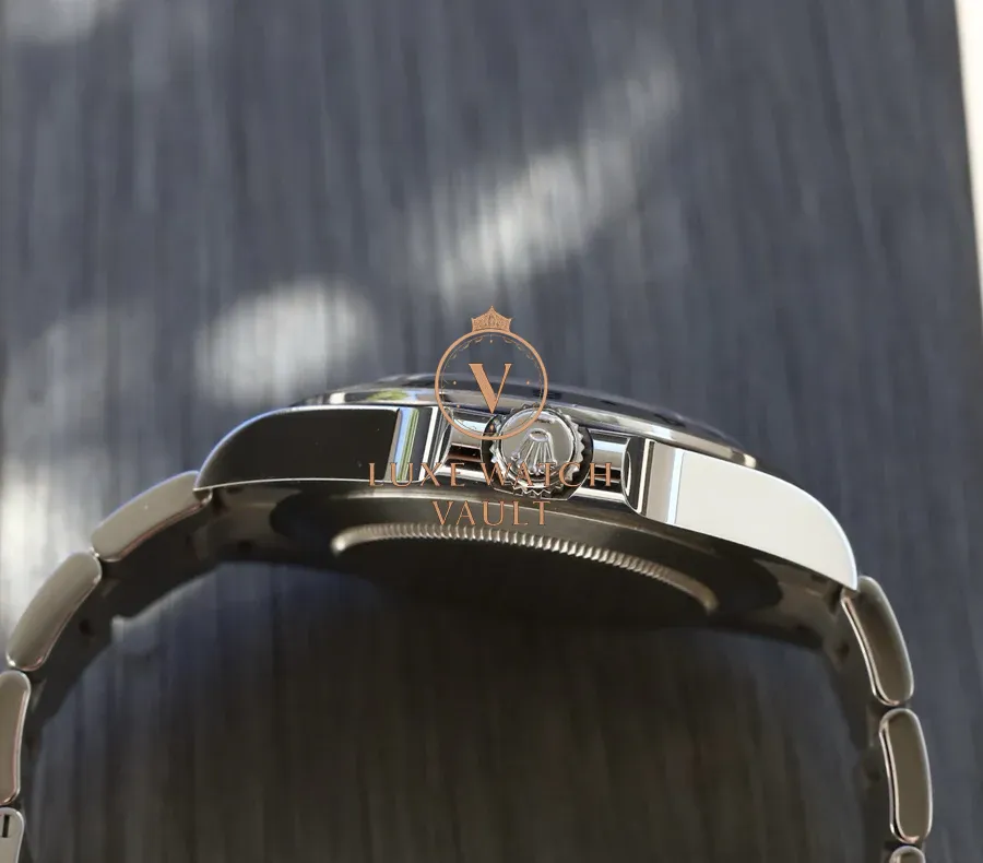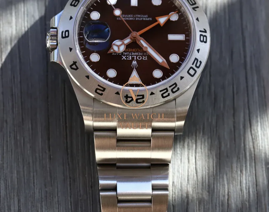 Featuring a 42mm Oystersteel case topped with a stunning sunburst 24-hour fixed bezel, it houses a maxi-dial with orange second timezone hand, and is powered by the calibre 3285.