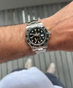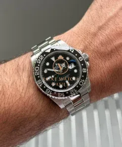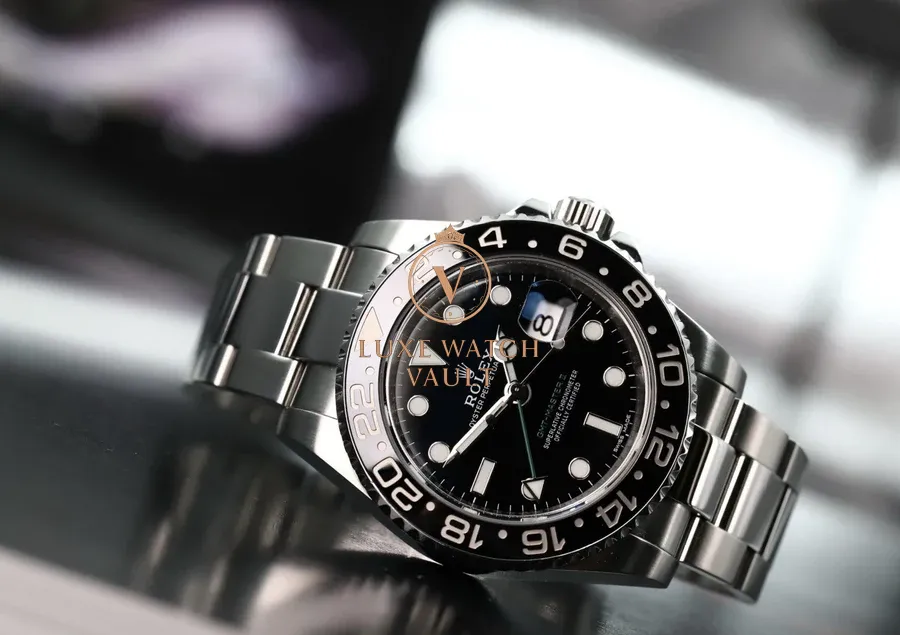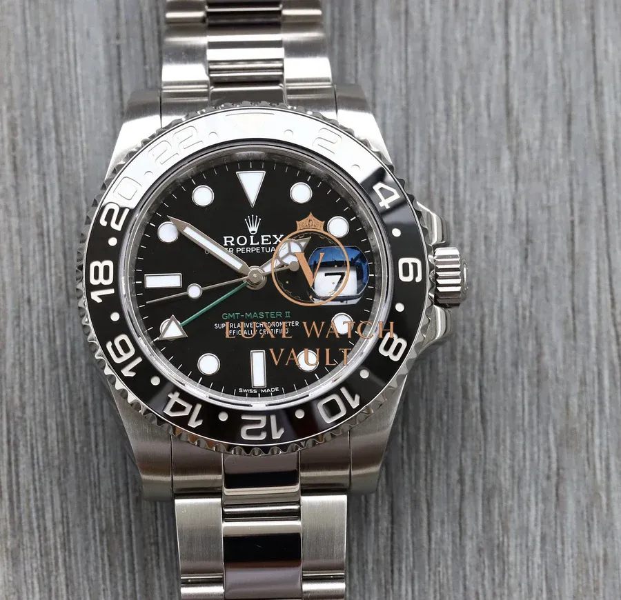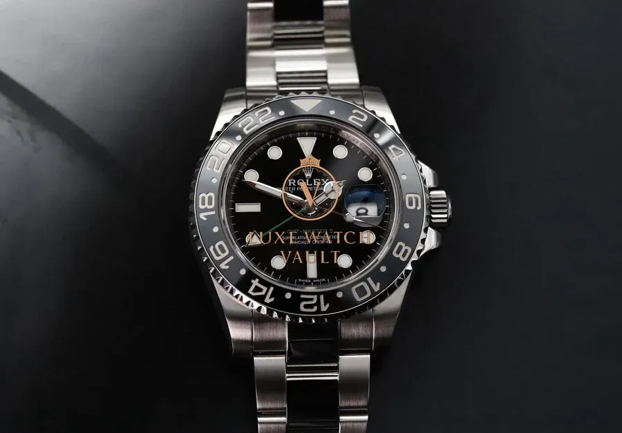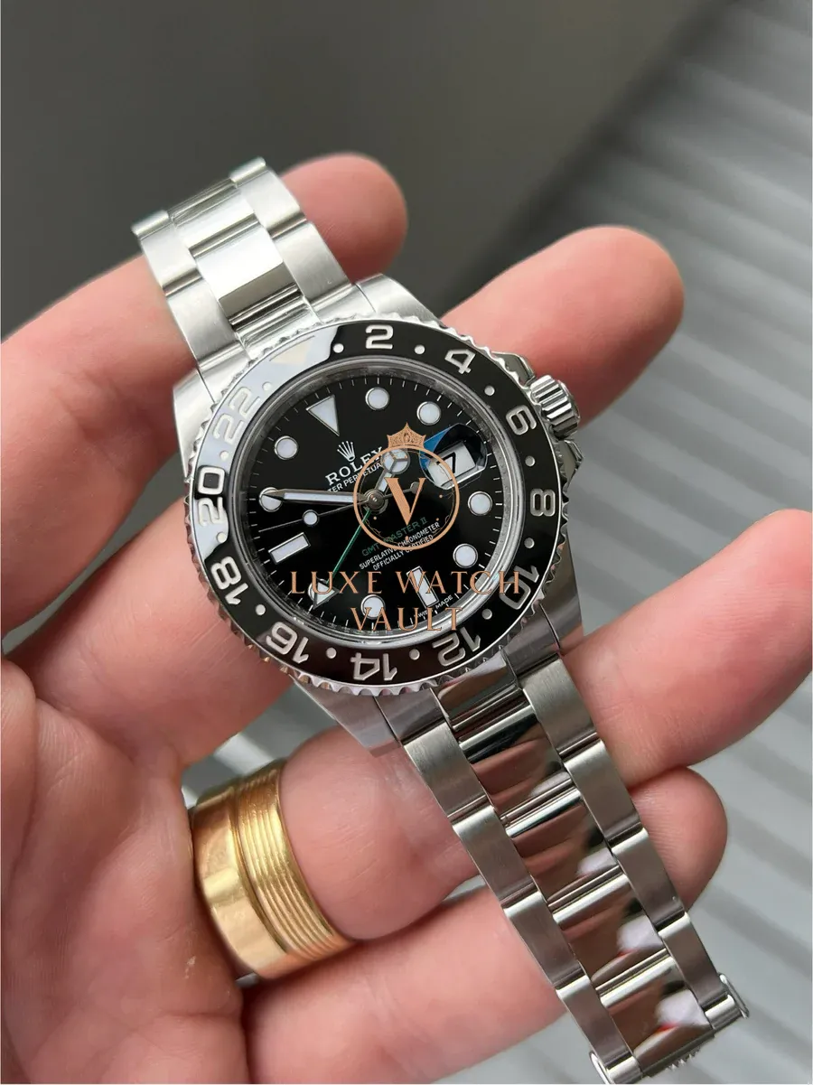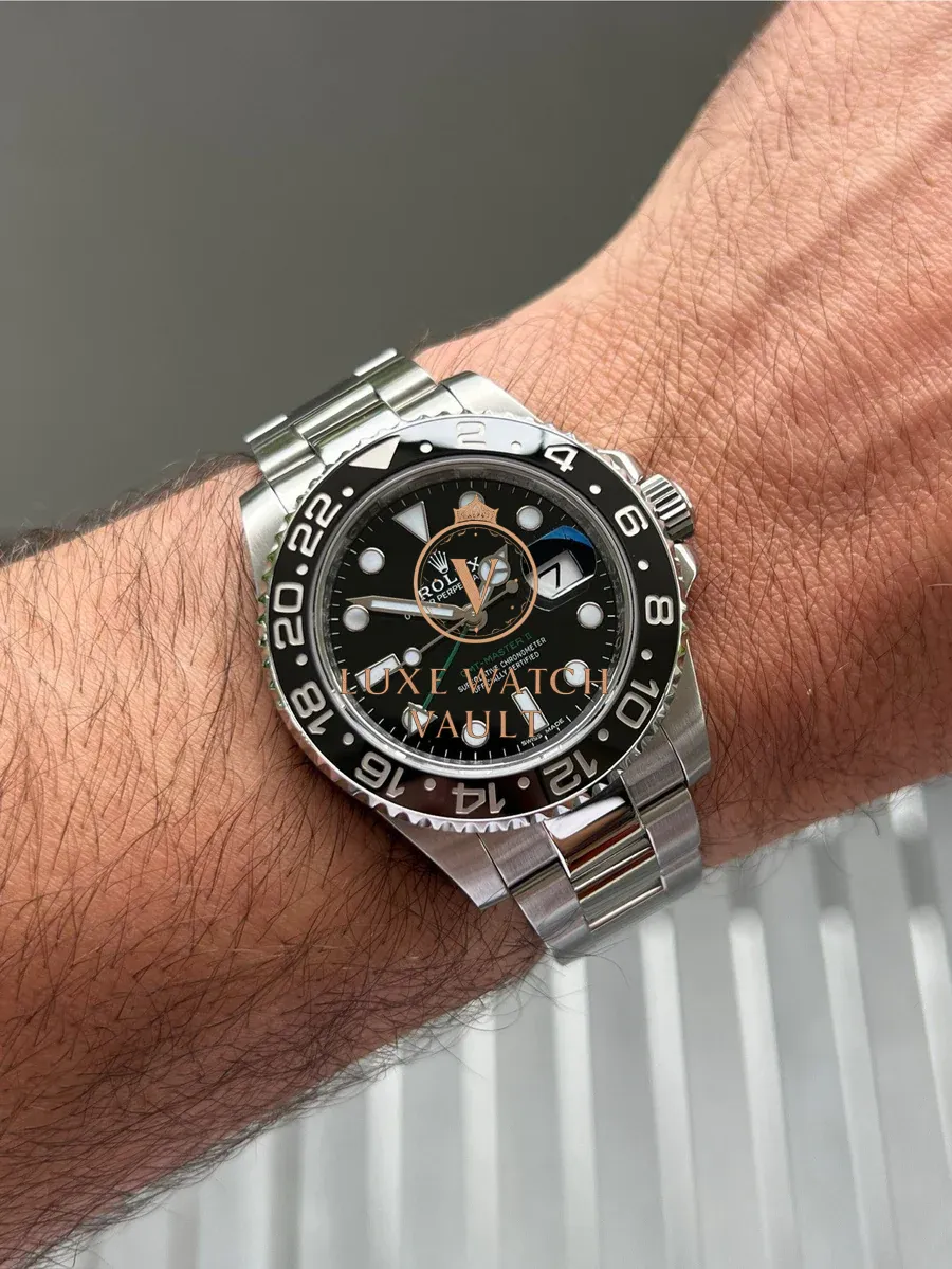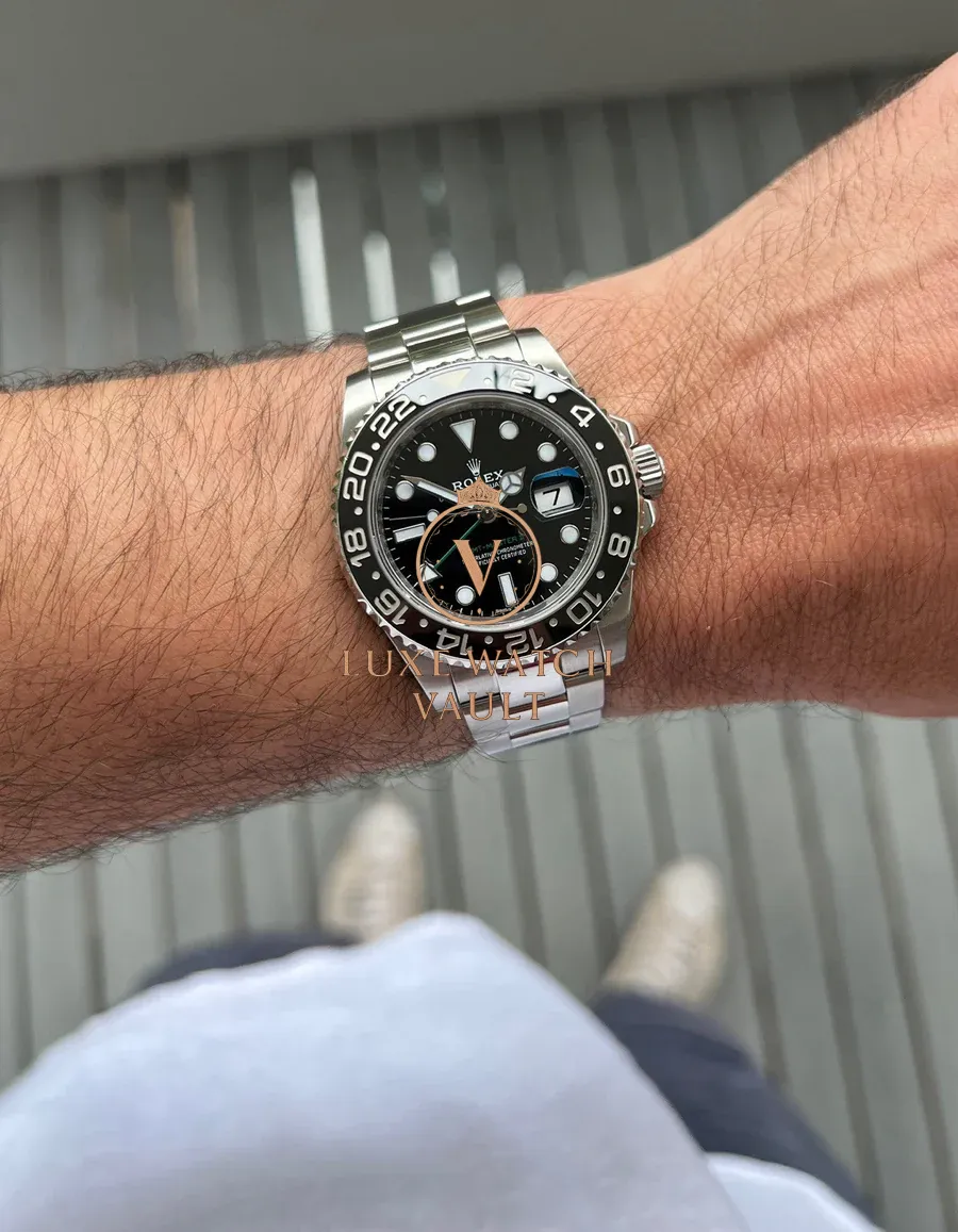 Originally created at the request of PanAm to assist their pilots when traveling through multiple timezones, the GMT has been a staple of the Rolex range since the 50’s. This particular version, the 116710LN, was released in 2008 and received the new Rolex Maxi case, Maxi dial, Ceramic Bezel and Triplock Crown ushering in the latest era of the GMT. The LN black version was discontinued in 2019 and is now highly sought after.