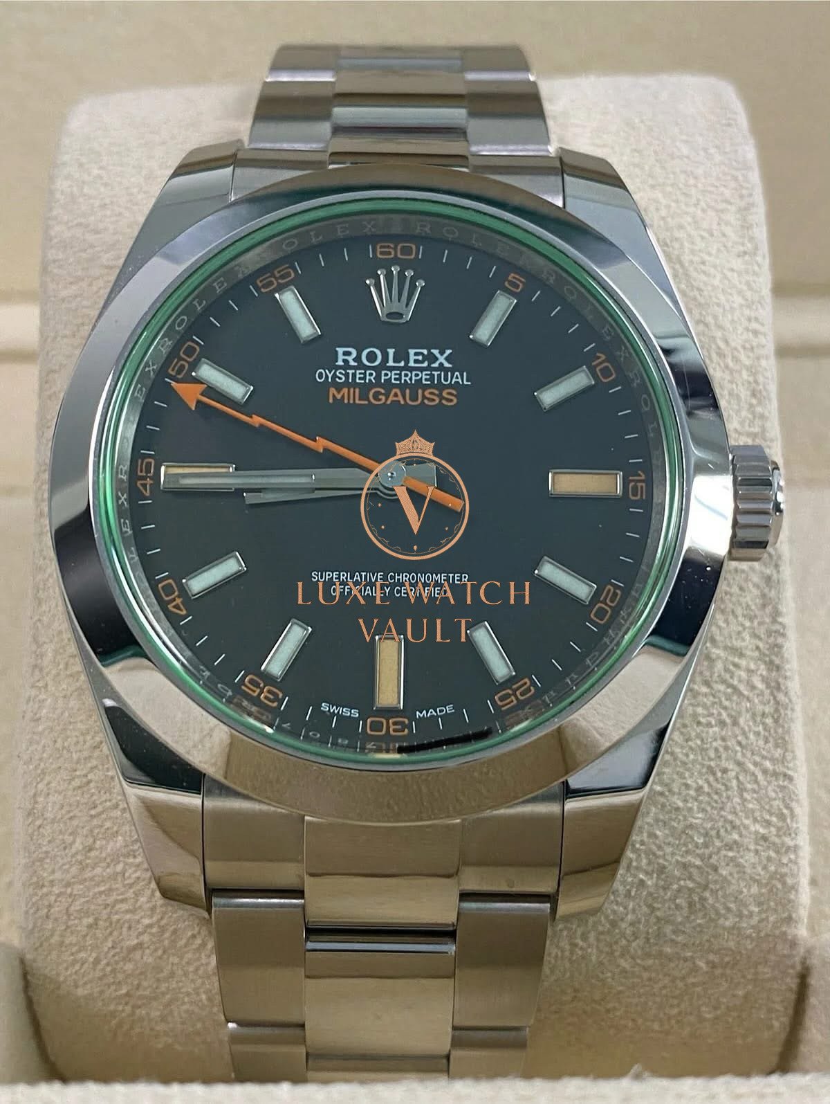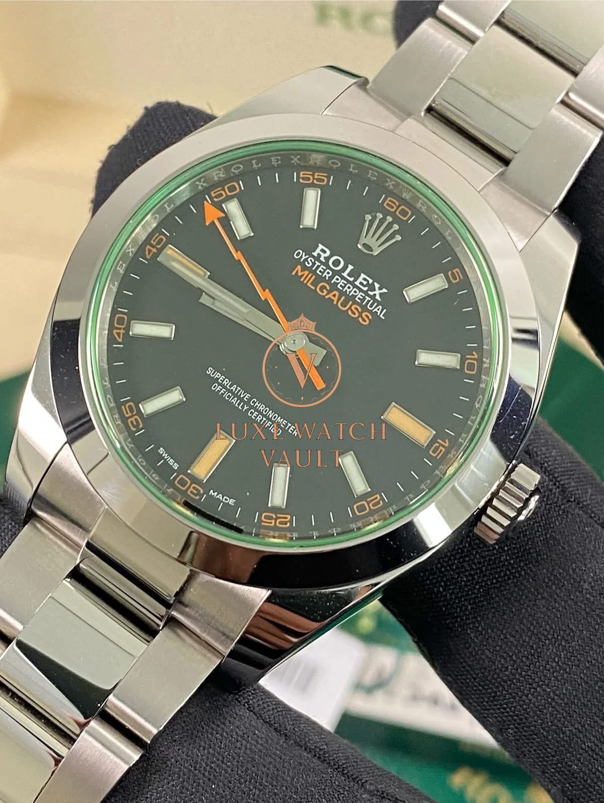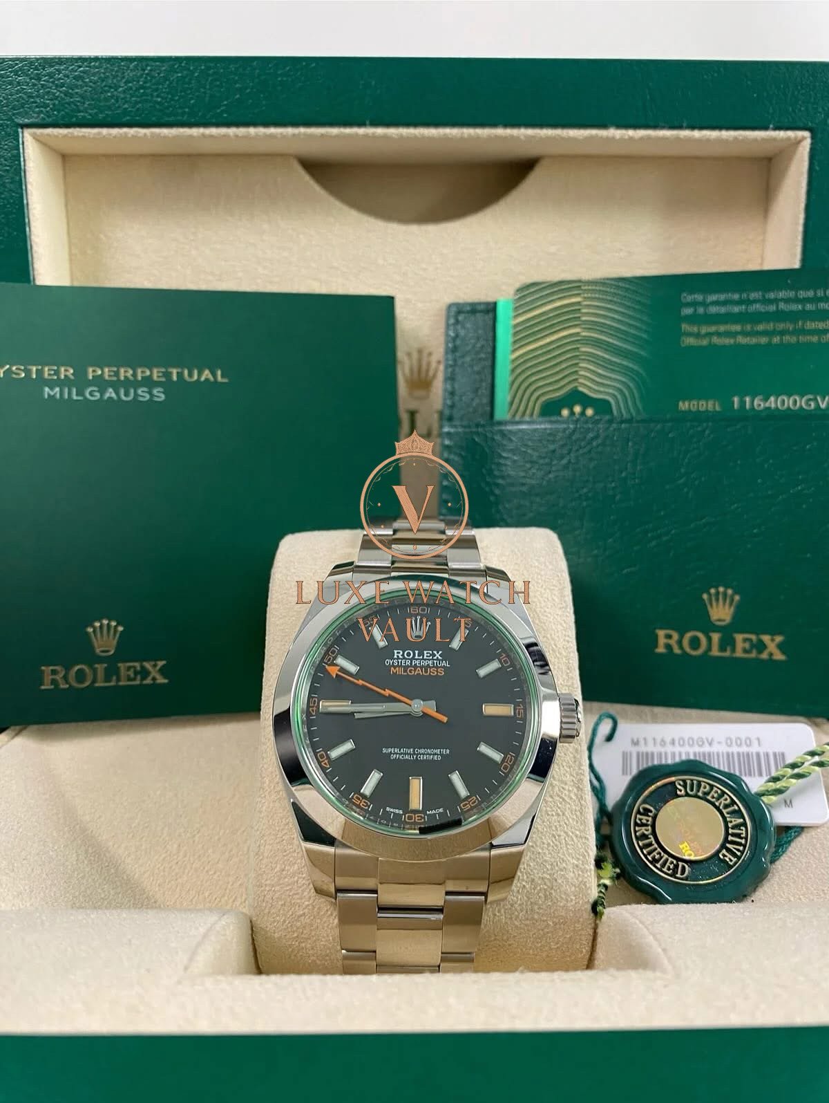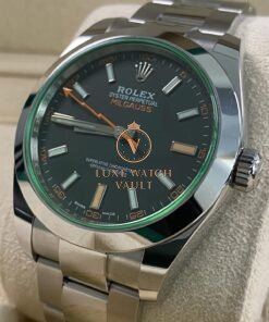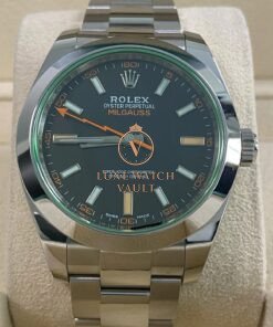 Rolex Milgauss – 2021 – Black Dial Green Crystal – 116400GV *UNPOLISHED* $11,500🚢Pre-owned Rolex Milgauss 116400GV, 40mm steel case, black dial, steel bezel, automatic movement, 48h power reserve, with original box, papers, and 1-year warranty. Factory 5-year warranty valid until August 2026.