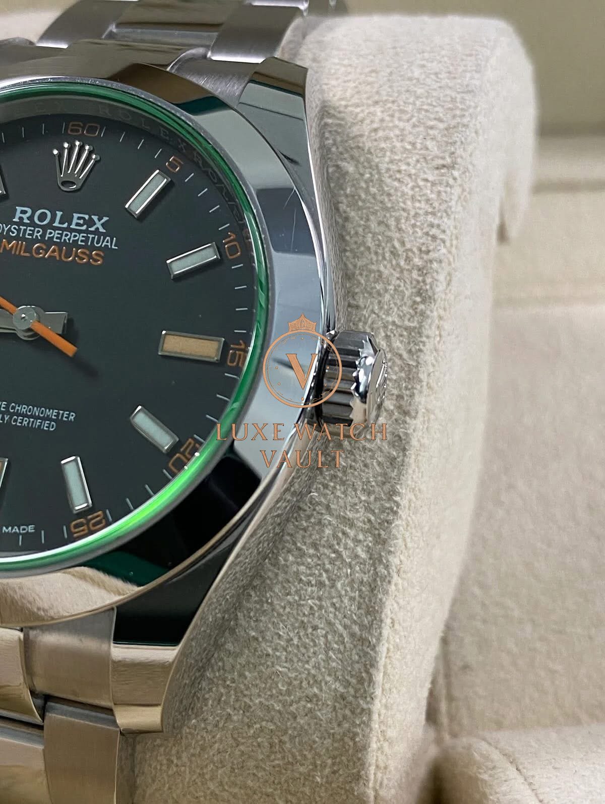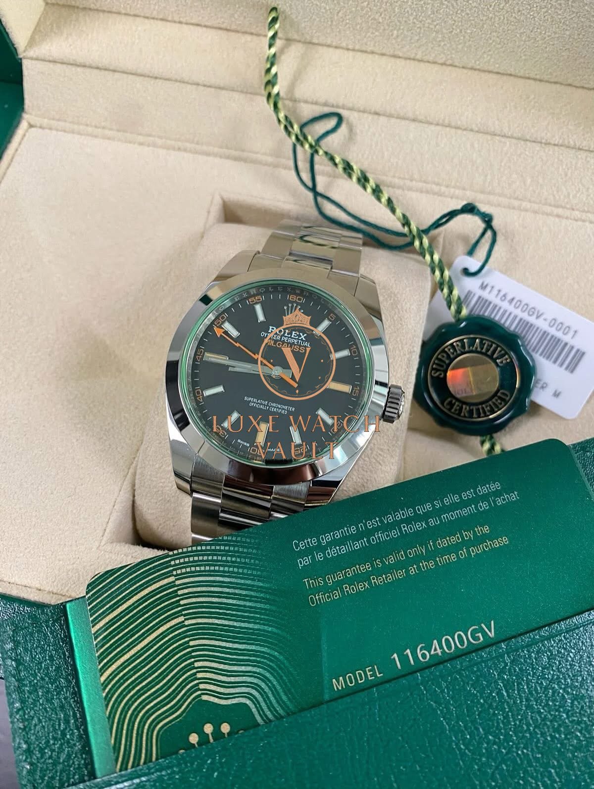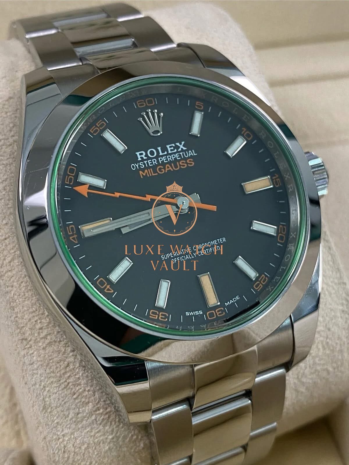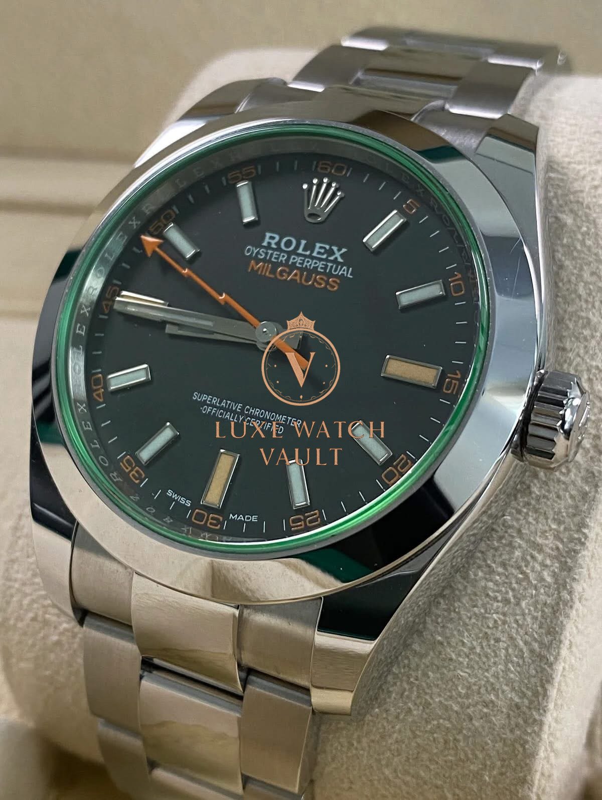 Rolex Milgauss – 2021 – Black Dial Green Crystal – 116400GV *UNPOLISHED* $11,500🚢Pre-owned Rolex Milgauss 116400GV, 40mm steel case, black dial, steel bezel, automatic movement, 48h power reserve, with original box, papers, and 1-year warranty. Factory 5-year warranty valid until August 2026.