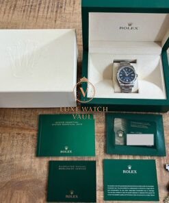Comes with outer box, inner box, card holder, instruction booklet, guarantee manual, warranty card dated mid-2023, green hang tag, spare link to complete the bracelet and Watch Vault cleaning cloth.