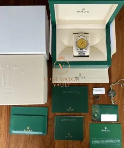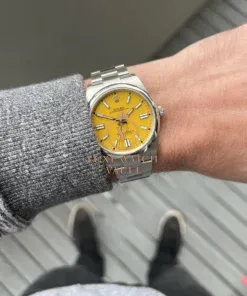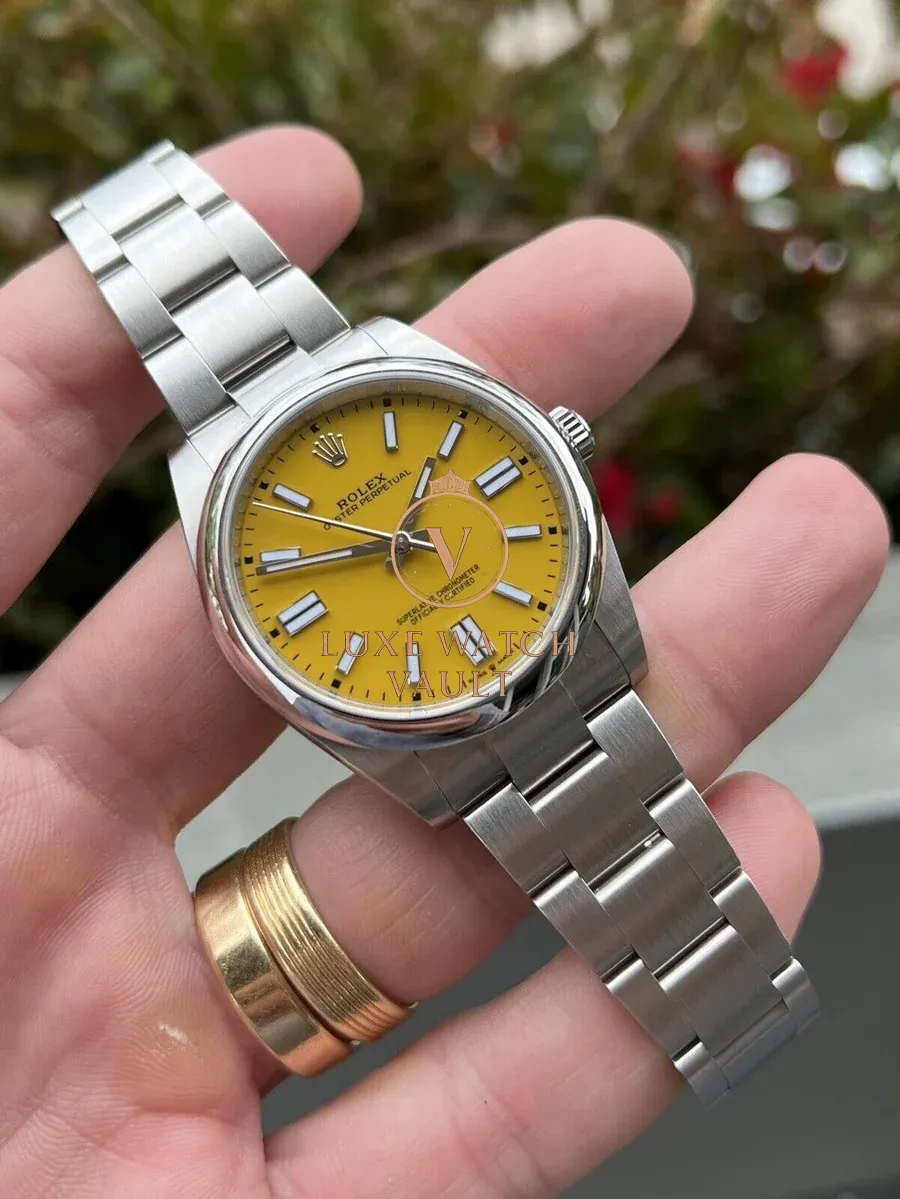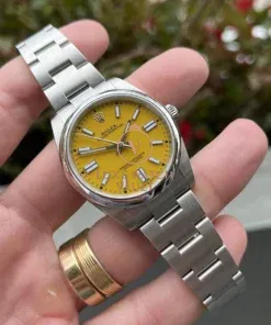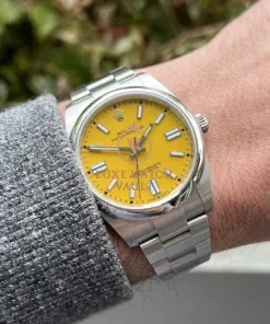 Traditionally an overlooked entry point into modern Rolex pieces, the OP series began gaining traction with enthusiasts a couple of years ago as a perfect daily-wearing, under the radar Rolex. In 2020 Rolex updated the series, and released them in a range of ‘Stella’ inspired dial tones including coral, pink, turquoise blue, green and perhaps our favourite of the range, this stunning deep yellow.