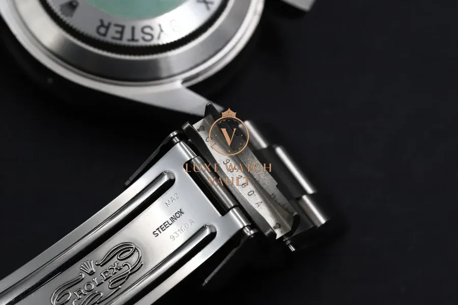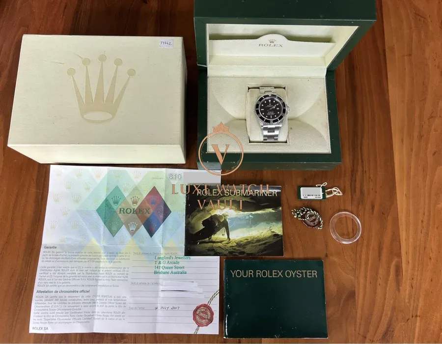 Paraphernalia: Outer box (shows wear), inner box (shows wear), hang tags, punched warranty papers (expired), Submariner booklet, bezel protector