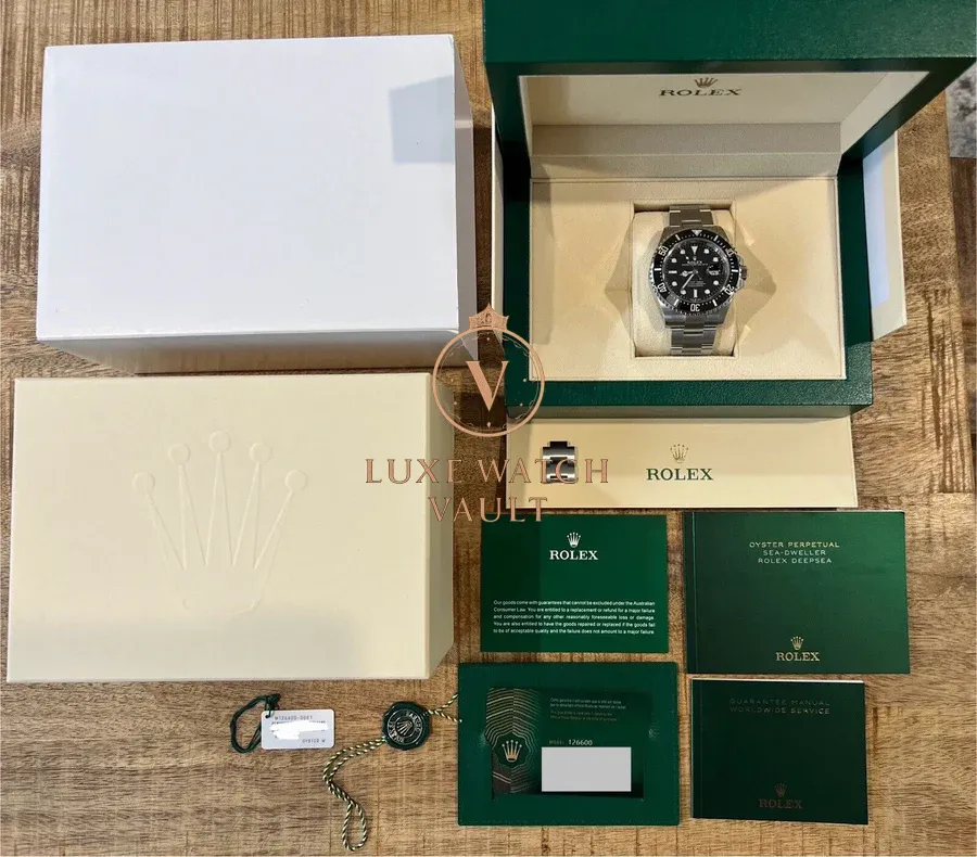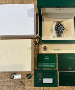 Comes with outer sleeve, outer box, inner box, card holder, instruction booklet, guarantee manual, warranty card dated mid-2021, green hang tag, white hang tag, spare links to complete the bracelet and Watch Vault cleaning cloth.