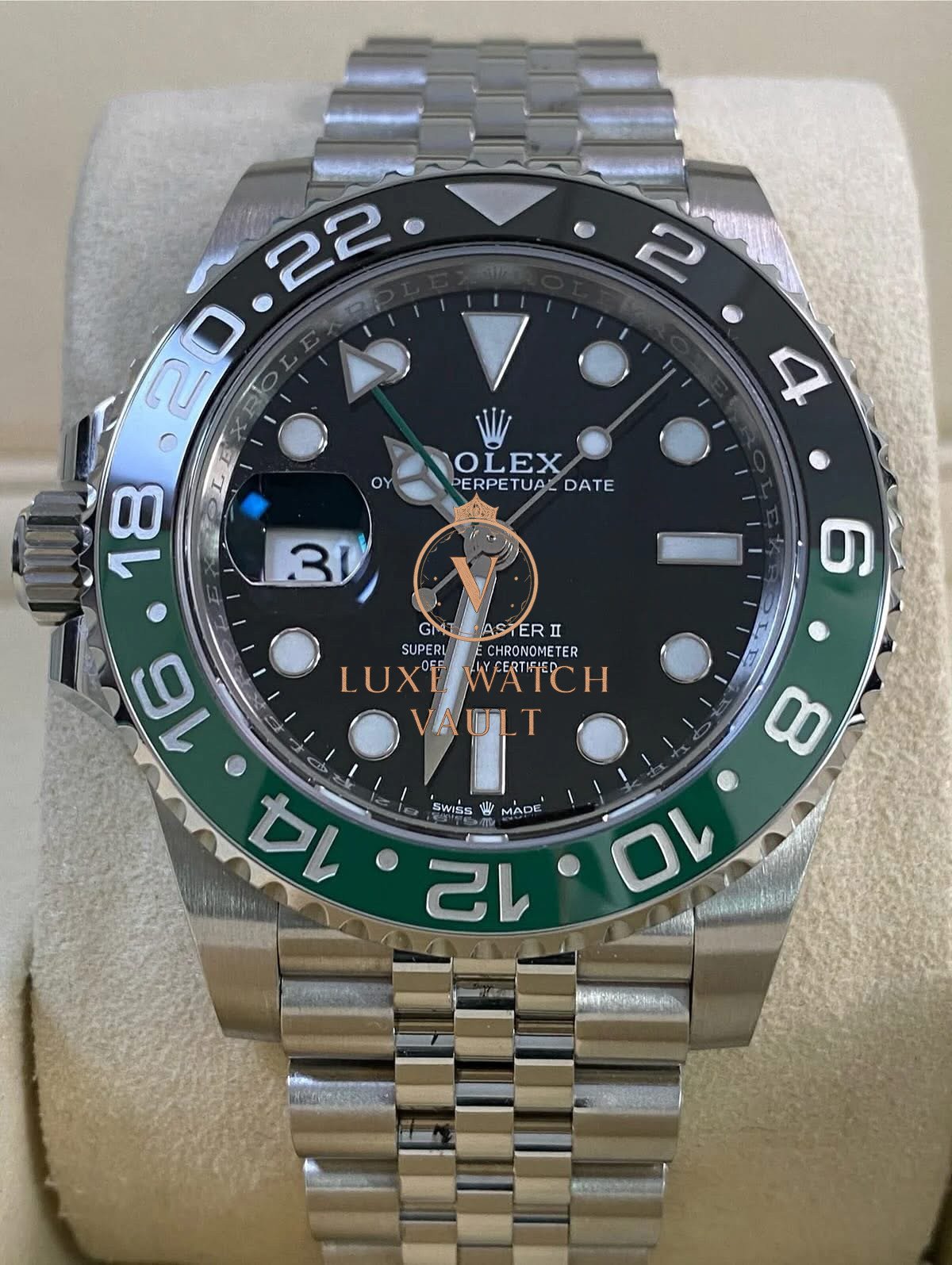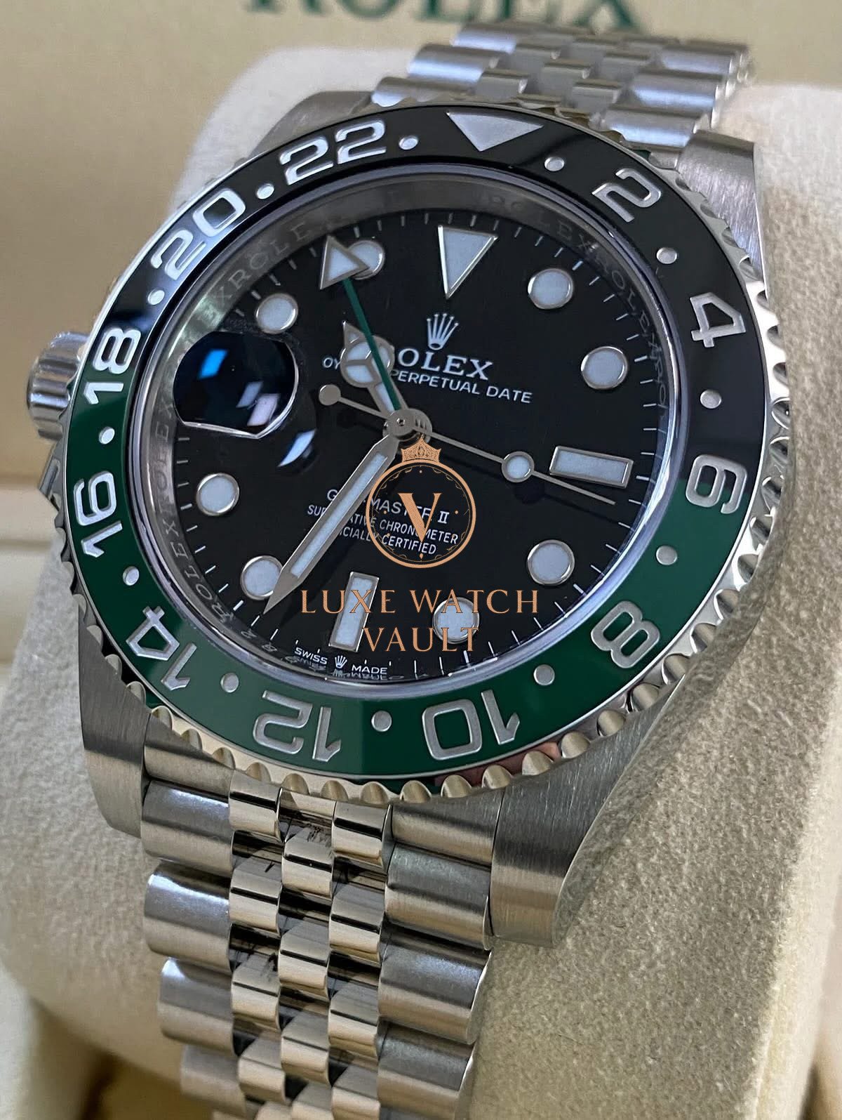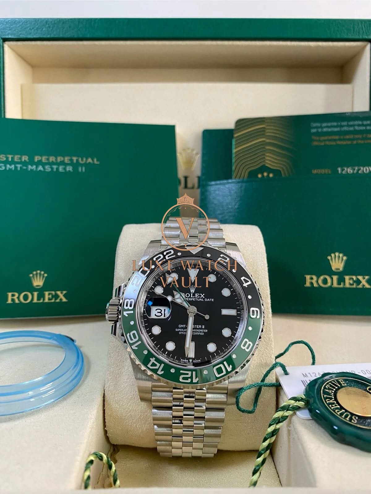 Rolex Steel Left-Handed GMT-Master II – 2025 – “Sprite” – Jubilee Bracelet – 126720VTNR *FULL SET* $16,500🚢Rolex GMT-Master II “Sprite” 126720VTNR. 40mm steel case, black dial, green/black ceramic bezel. Unworn, complete with original accessories, 5-year warranty, and papers.