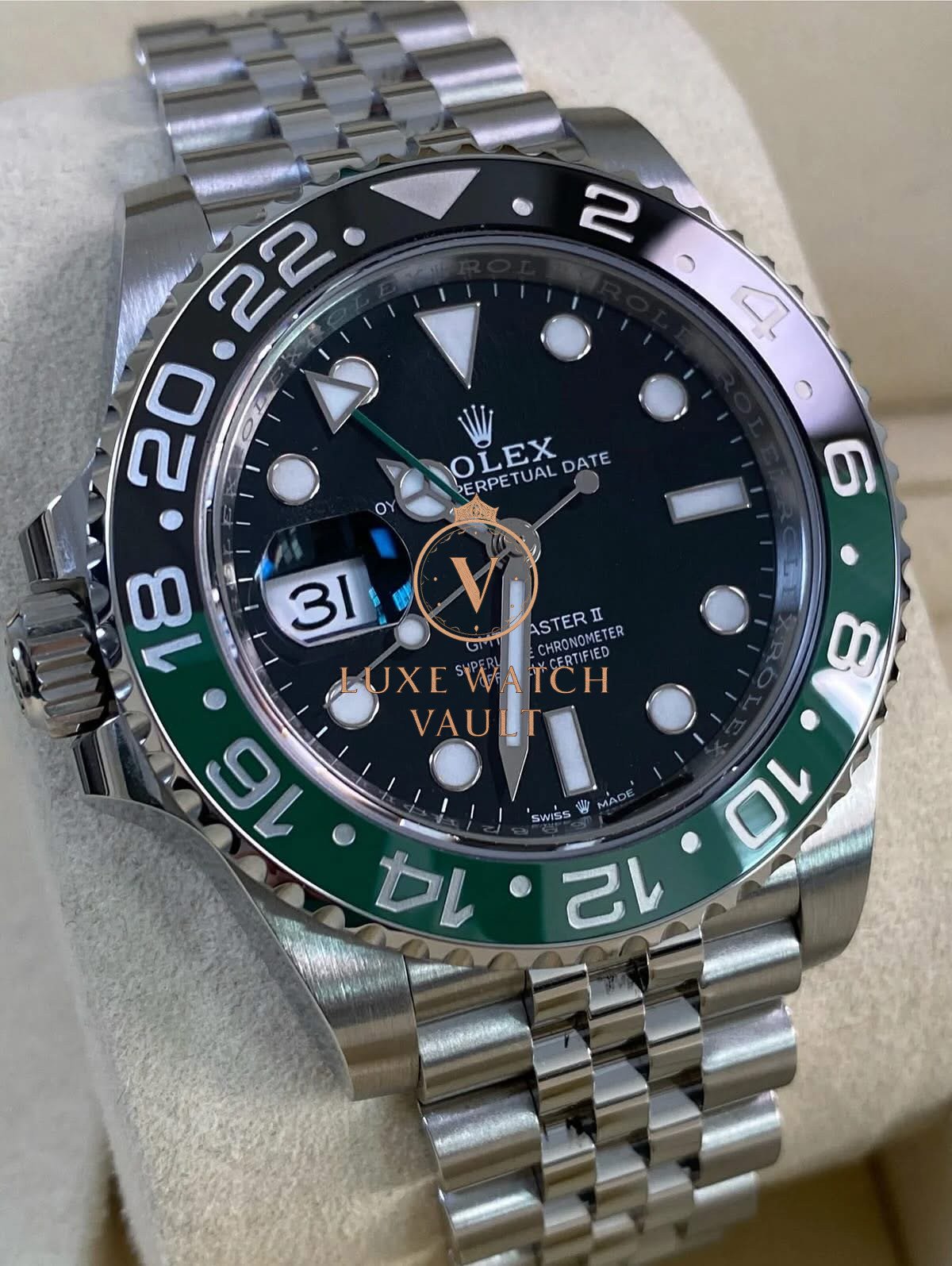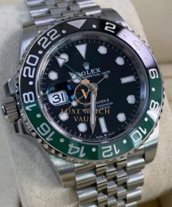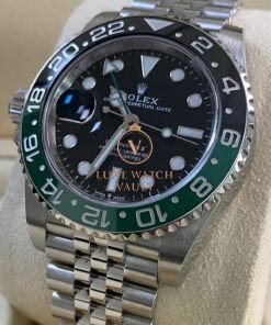 Rolex Steel Left-Handed GMT-Master II – 2025 – “Sprite” – Jubilee Bracelet – 126720VTNR *FULL SET* $16,500 Rolex GMT-Master II “Sprite” 126720VTNR. 40mm steel case, black dial, green/black ceramic bezel. Unworn, complete with original accessories, 5-year warranty, and papers.