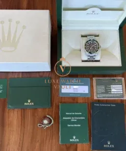 Comes with outer box (shows wear), inner box, guarantee manual, instruction manual, Sub booklet, original warranty card (expired), RSC service card, hang tag, card holder and Watch Vault cleaning cloth.