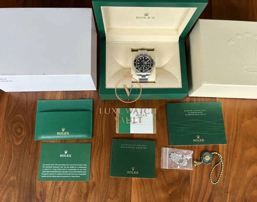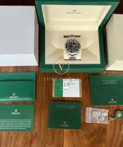 Paraphernalia: Outer sleeve, outer box, inner box, service manual, instruction manual, card holder, warranty card (expired), green hangtag, spare links to complete the bracelet and Watch Vault cleaning cloth.