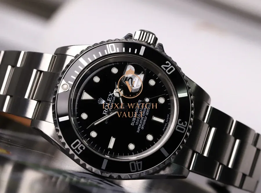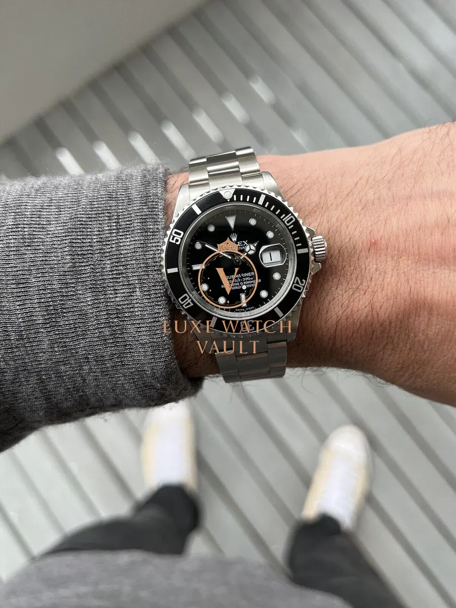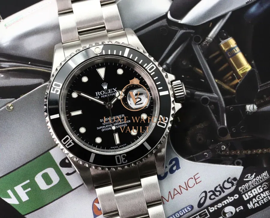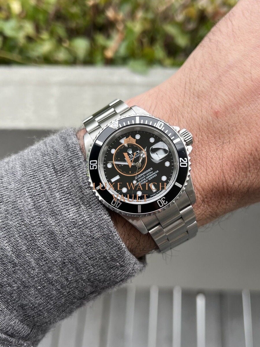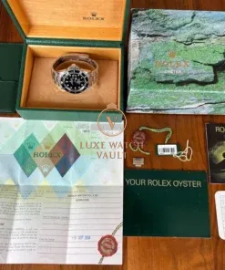 Comes with outer box (correctly stickered with 16610), inner box, booklets, calendar, spare link, both hang tags, stamped and dated papers (expired) and Watch Vault cleaning cloth.