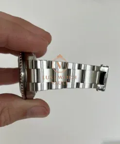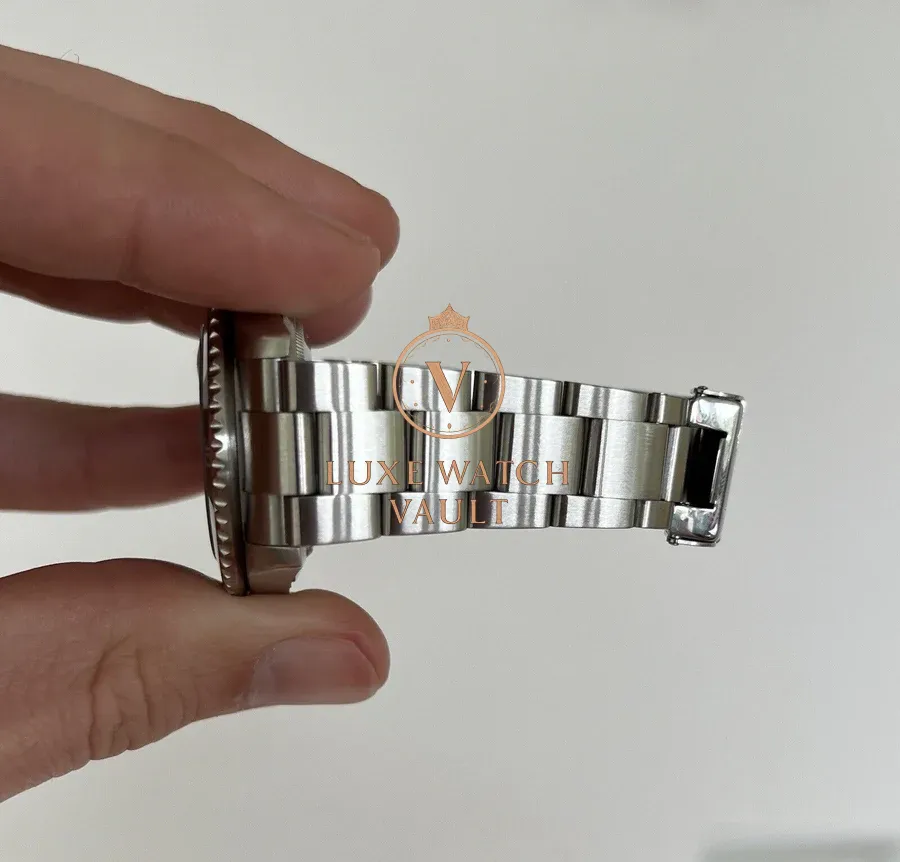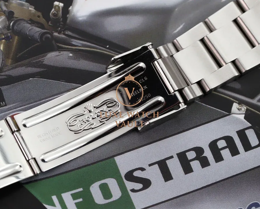 Bracelet is a Rolex 93250 with 10 links, plus 1 spare and will fit roughly an 8in wrist with all links fitted. Solid endlinks (SEL). Date code is CL6, so correct for the year of manufacture of the watch. Shows very light stretch, and a couple of small desk diving marks.