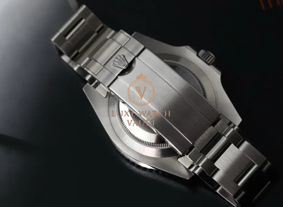Bracelet shows only very light desk diving marks, and has 9 links, plus a half link. Will fit up to around a 7.4in wrist at full extension on the clasp. Shows minor desk dive marks.