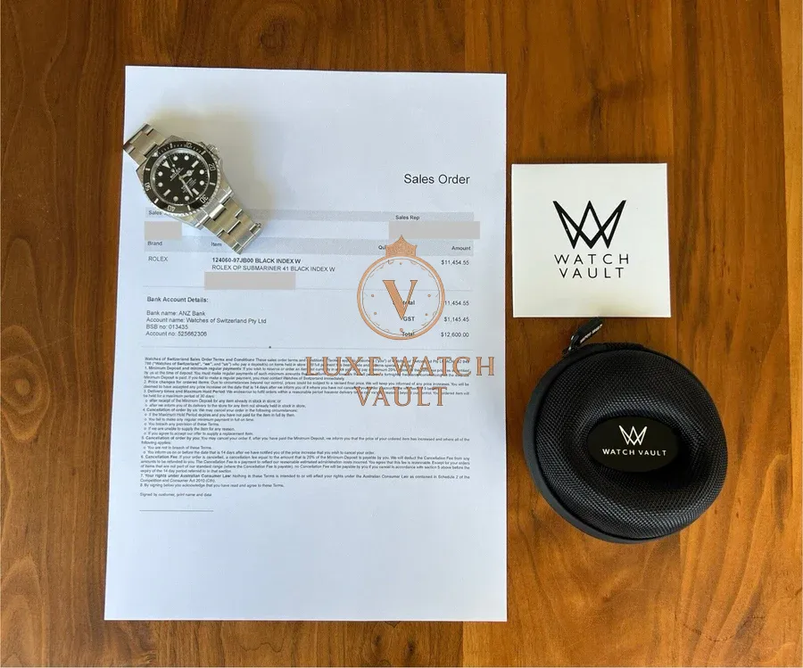 No box or papers. Comes with a copy of the original Sales Order from a local AD, and Watch Vault Travel Pod.