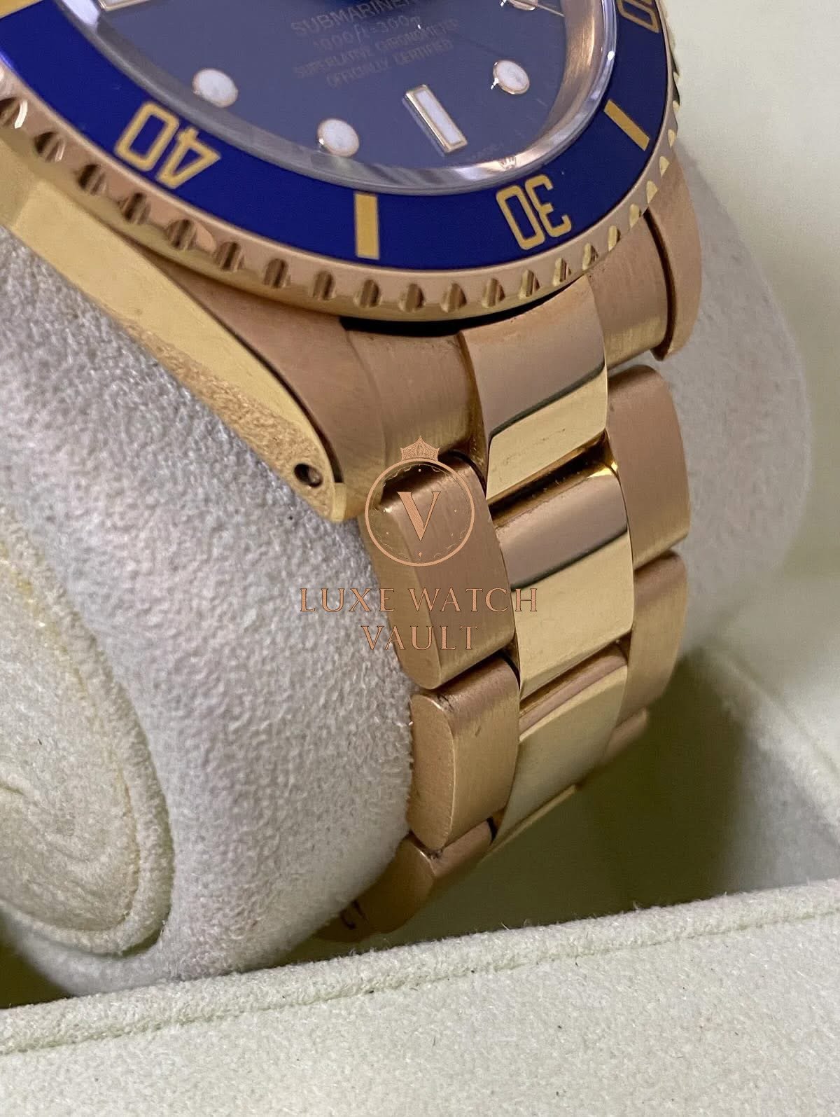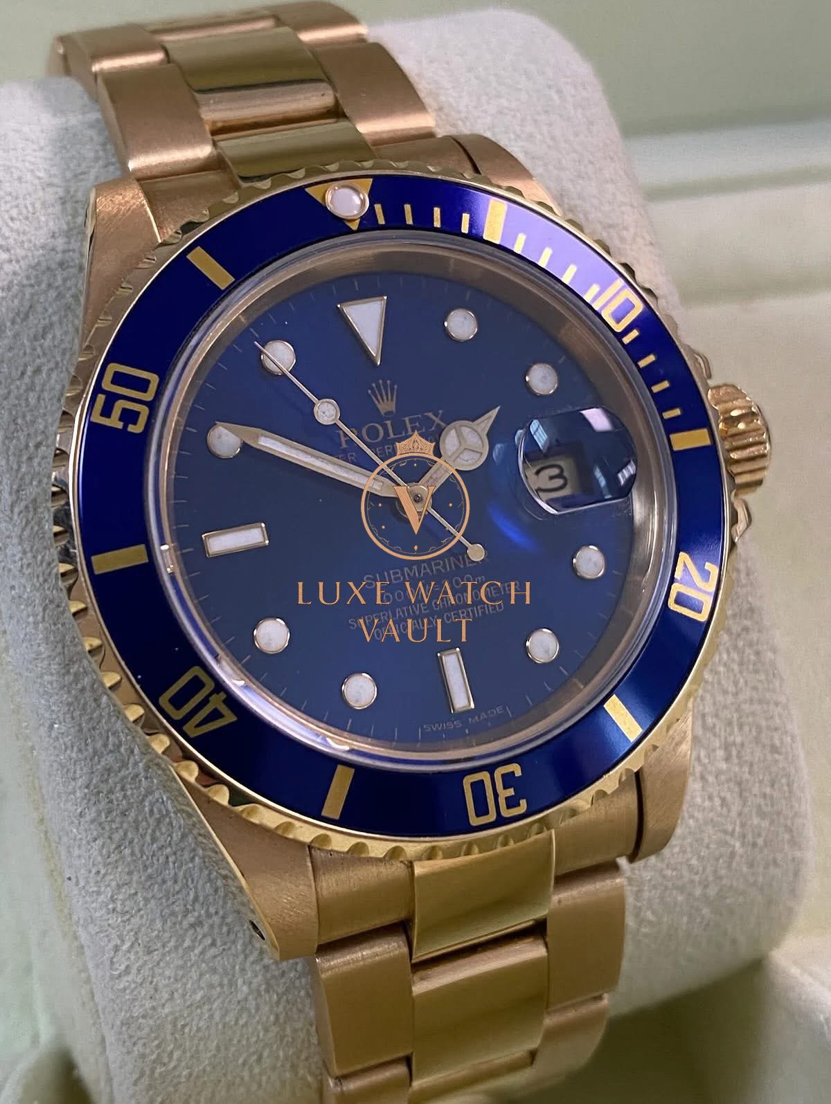 Rolex Yellow Gold Submariner Date – 1984 – “Bluesy” Pre Ceramic Bezel – 16618 $20,500🚢Pre-owned 1984 Rolex Submariner Date “Bluesy” in mint condition with original box and 1-year warranty. Features 40mm yellow gold case, blue dial, and automatic movement.