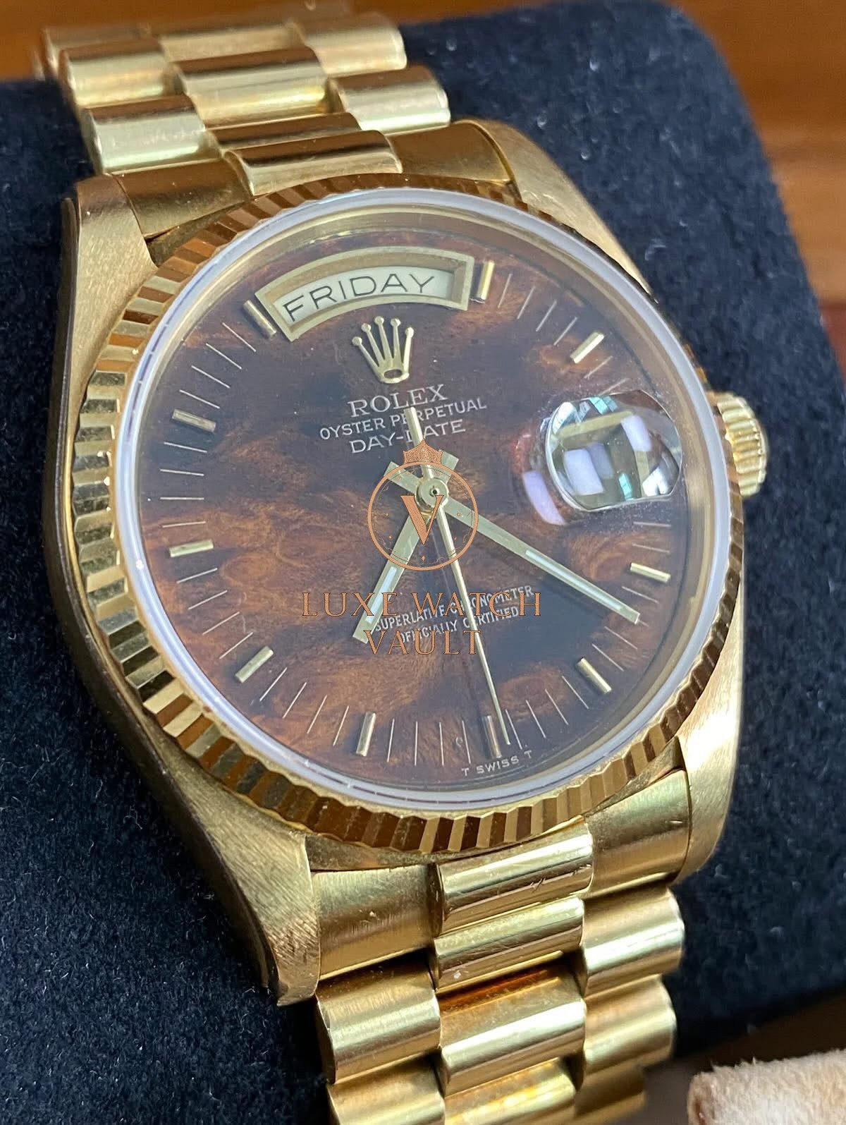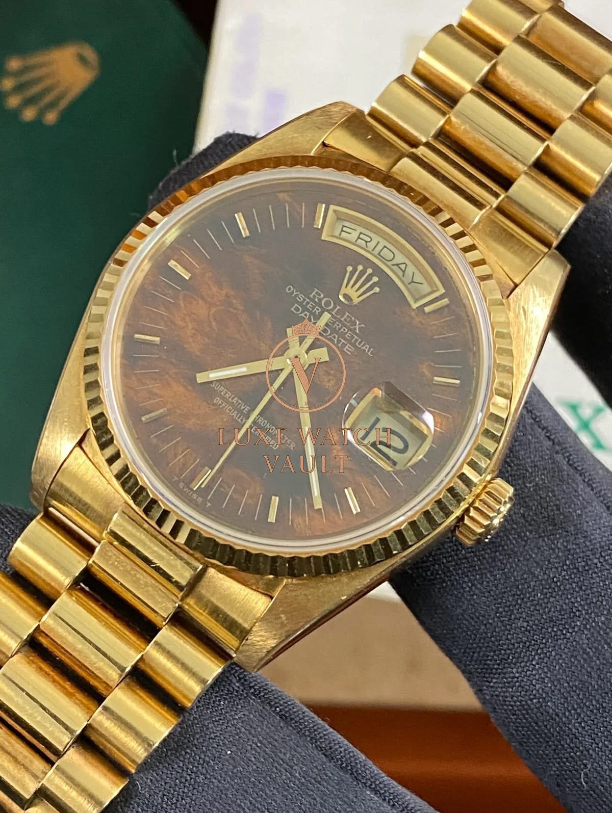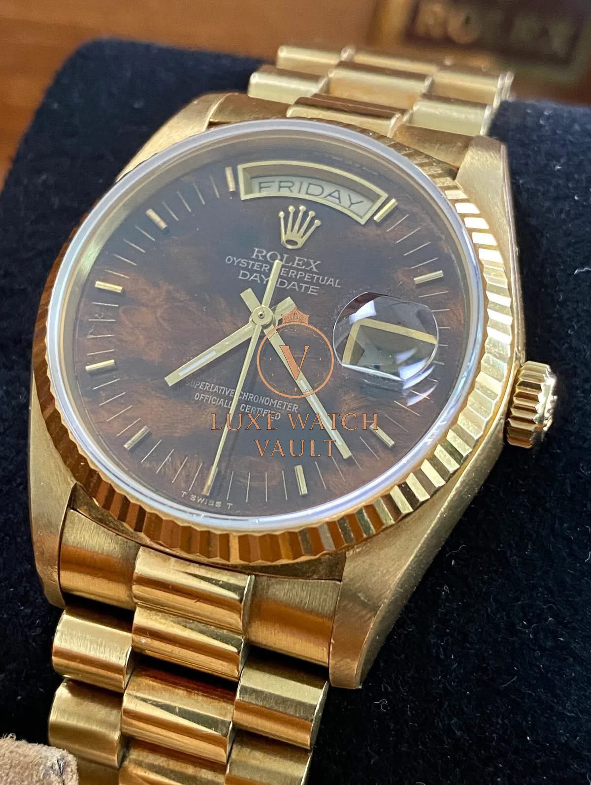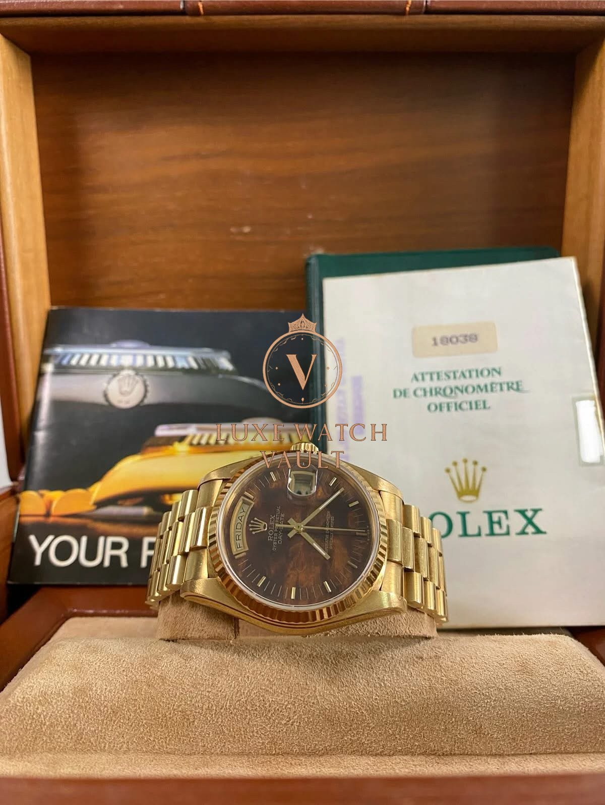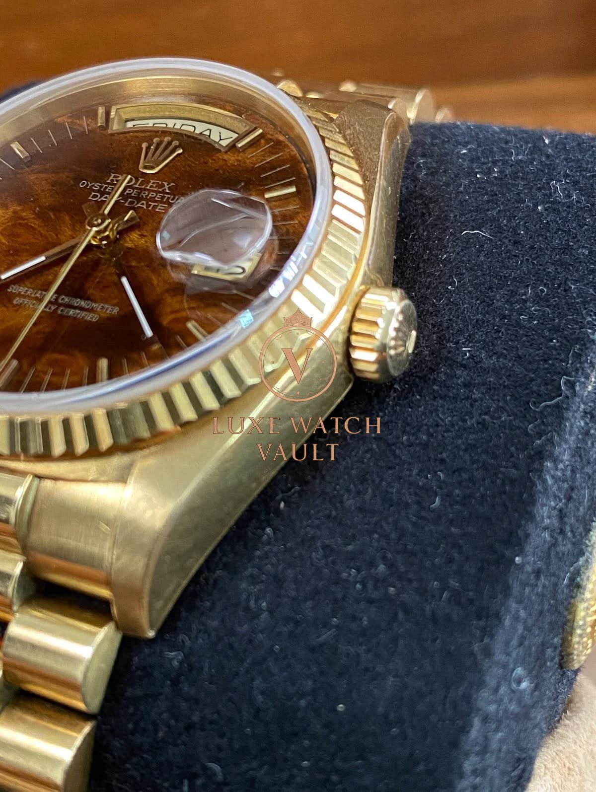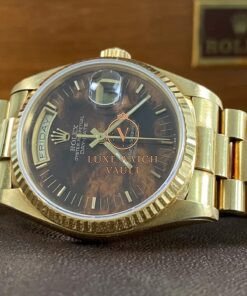 Rolex Yellow Gold Day-Date 36 – 1987 – Wood Dial – President Bracelet – 18038 *FULL SET*$40,500🚢Rolex Day-Date 36, reference 18038, 1987, 36mm, yellow gold, brown dial, President bracelet, with box and papers, pre-owned, 1-year warranty.